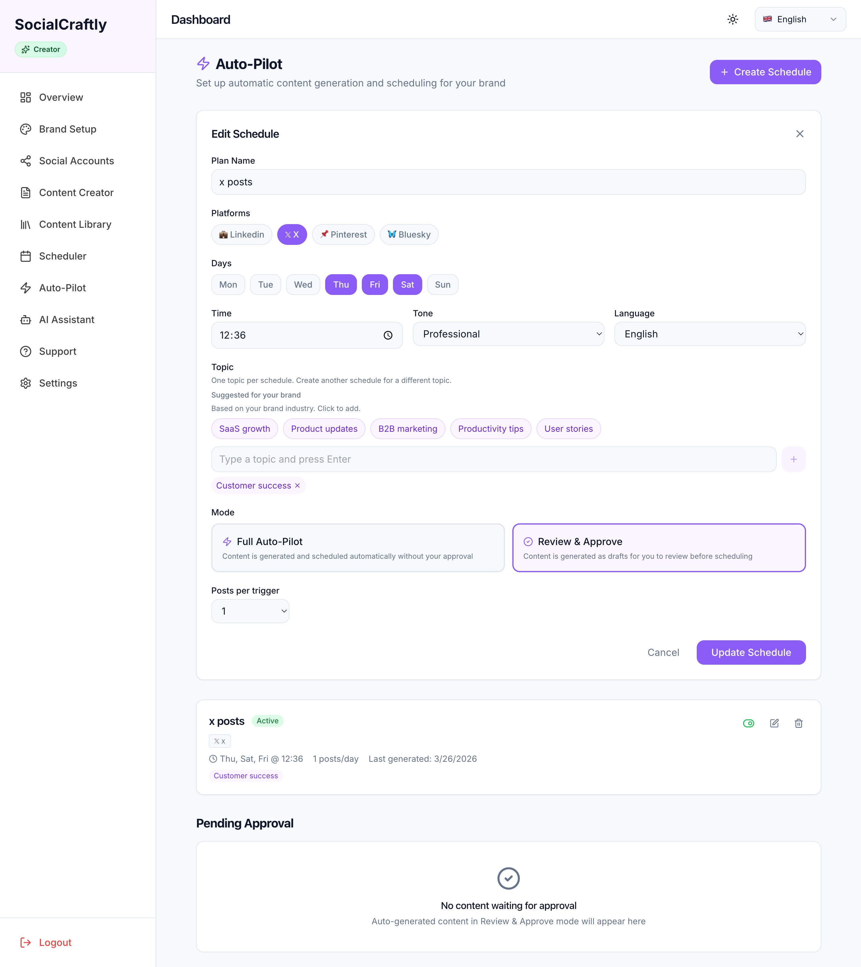 🚀 Auto Pilot v1.0: AI-assisted drafts + cross-platform scheduling + human approval. Go from idea to scheduled content in minutes. #ProductUpdate #AI #SaaS0