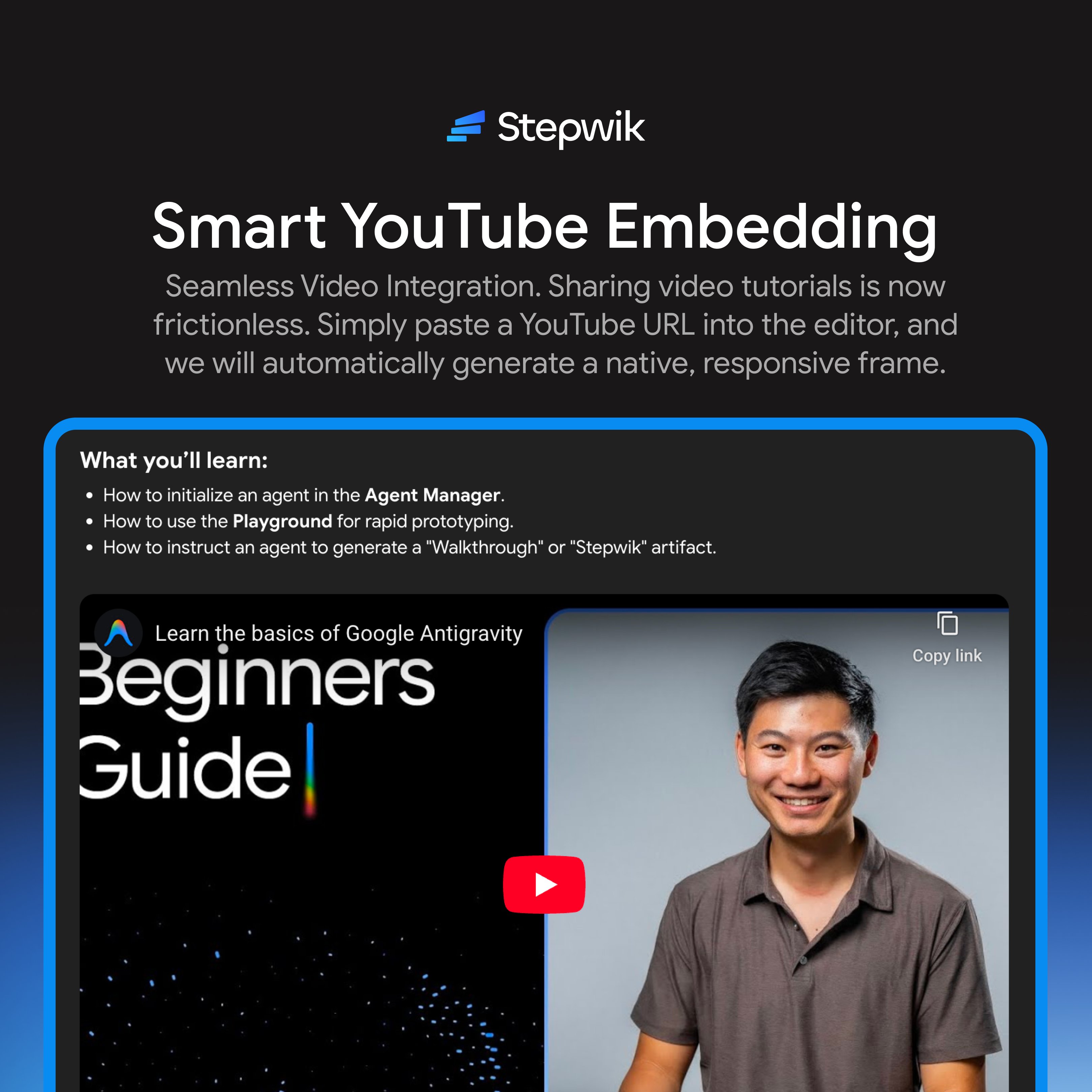 Sharing tutorials on #Stepwik just got frictionless. Now, you can turn YouTube URL into a native, player just by pasting the link