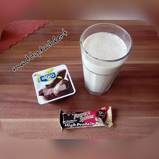 Stracciatella Proteinshake mit Proteinriegel und alpro dunkle Schokolade.