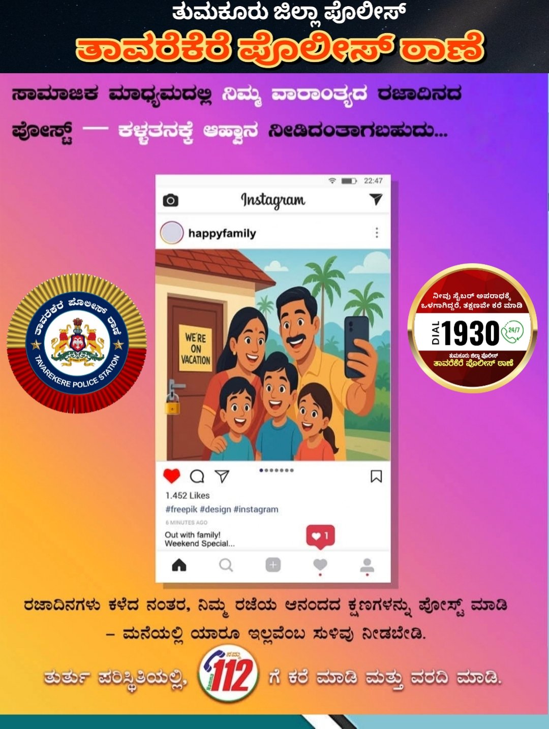 ಸಾರ್ವಜನಿಕರು ವಾರಾಂತ್ಯಕ್ಕೆ ಎಲ್ಲಾದರೂ ಹೊರ ಹೋಗುತ್ತಿದ್ದೀರಾ? ಅದು ಕಳ್ಳರಿಗೆ ತಿಳಿಯದಂತೆ ನೋಡಿಕೊಳ್ಳಿ! ನೀವು ಮನೆಗೆ ಮರಳುವವರೆಗೆ ಪ್ರಯಾಣದ ಪೋಸ್ಟ್ಗಳನ್ನು ಖಾಸಗಿಯಾಗಿ ಇರಿಸಿ.ಯಾವುದೇ ತುರ್ತು ಸ್ಥಿತಿಗೆ 112 ಡಯಲ್ ಮಾಡಿ.