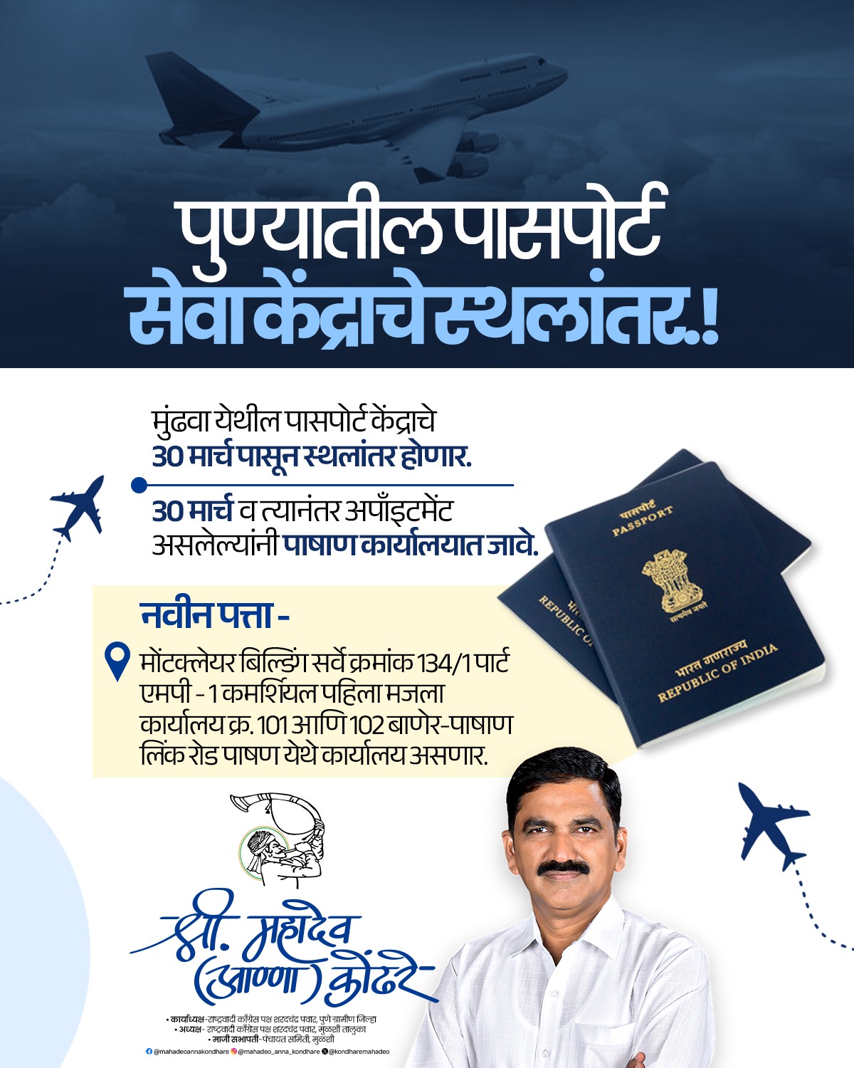 पुण्यातील नागरिकांसाठी एक महत्त्वाची माहिती आहे. मुंढवा येथील पासपोर्ट सेवा केंद्र आता दिनांक ३० मार्च २०२६ पासून पाषाण येथे हलविण्यात येत आहे.