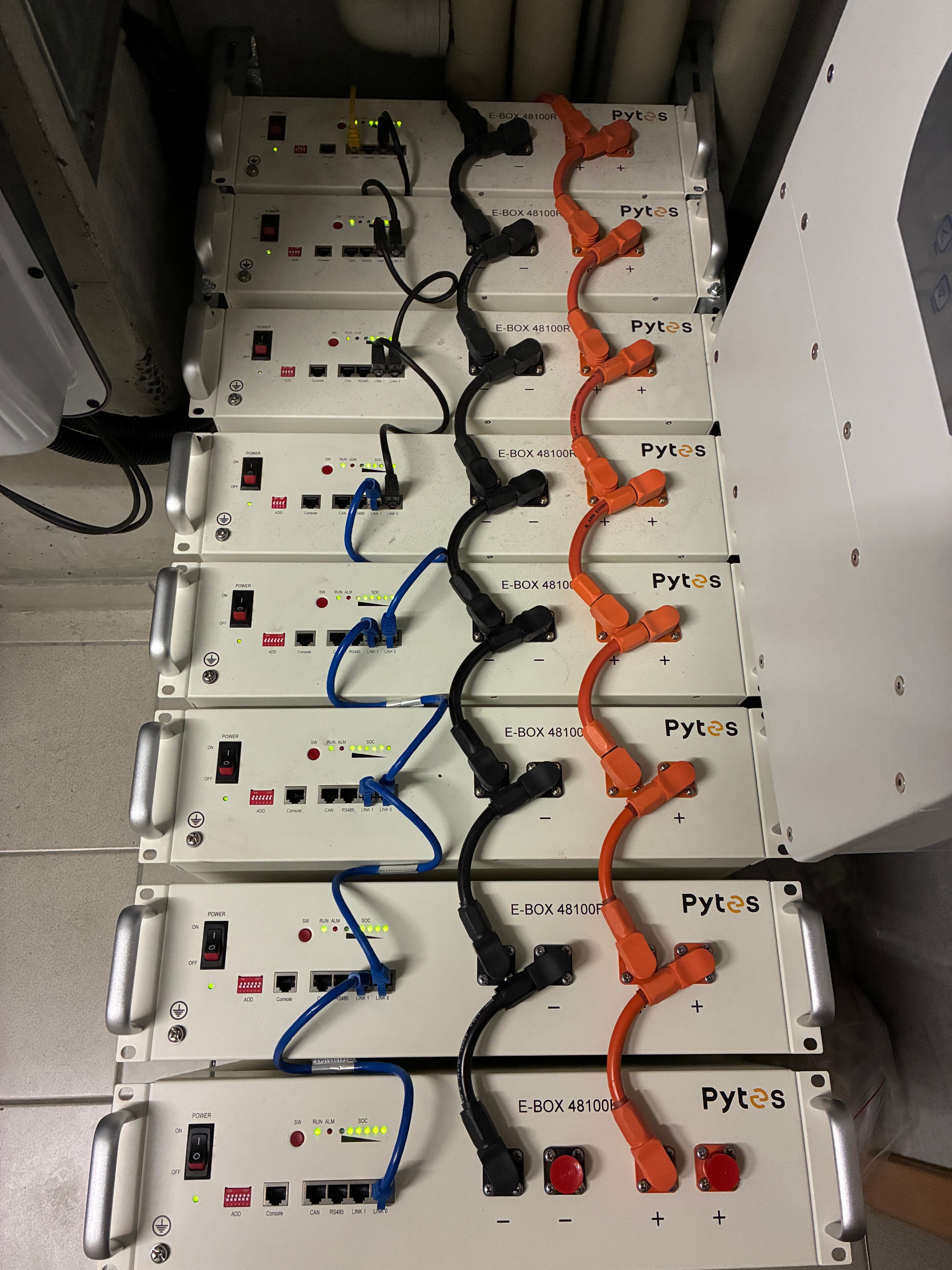 Die Erweiterung meines #Photovoltaik-Speichers ist vorerst abgeschlossen. Nachdem die acht #Pytes-Speichermodule á 5 kWh nach diversen Firmware-Updates nun miteinander harmonieren, stehen 40 kWh zur Verfügung. Hilfreich in Kombination mit dynamischem Stromtarif. #pvbuddies