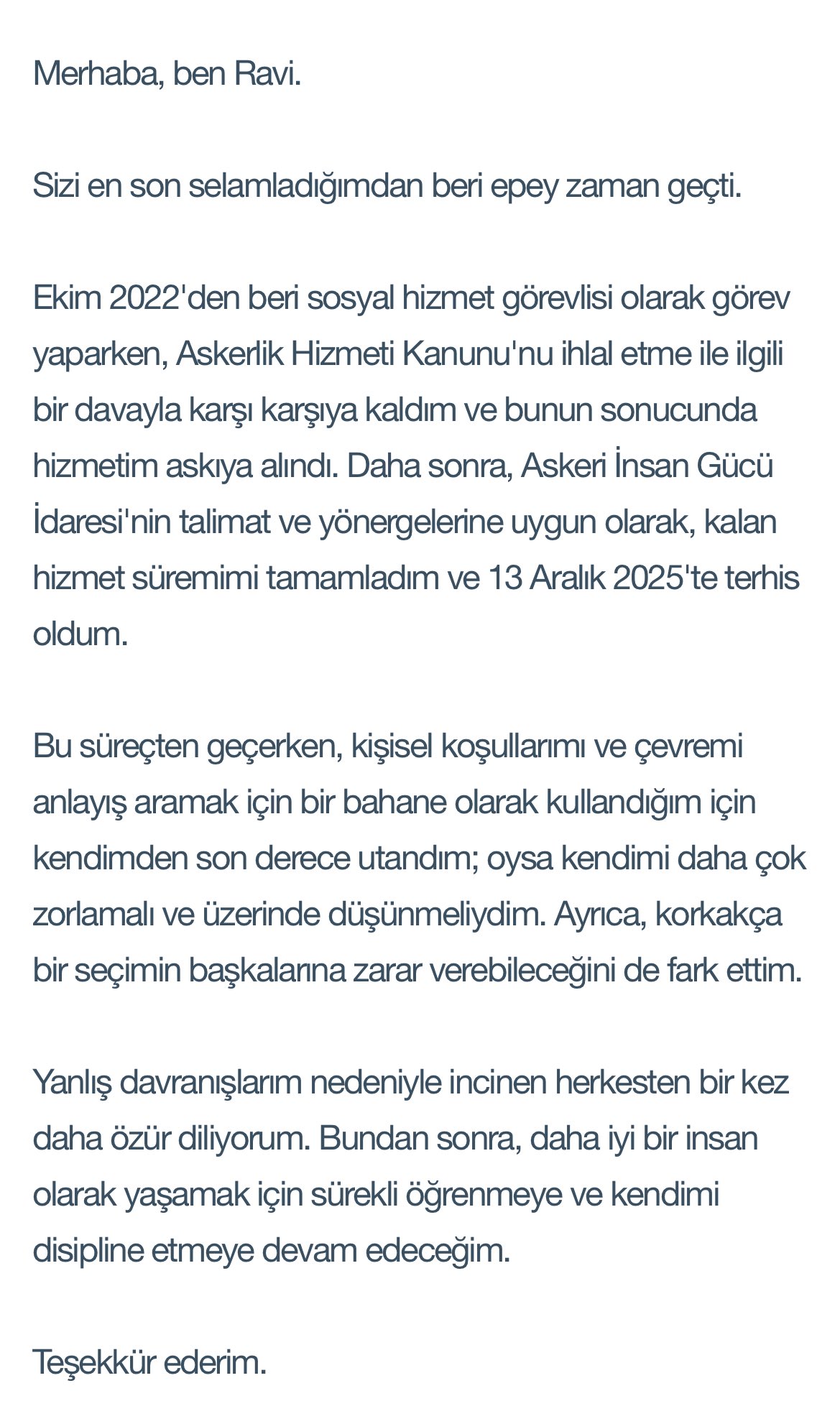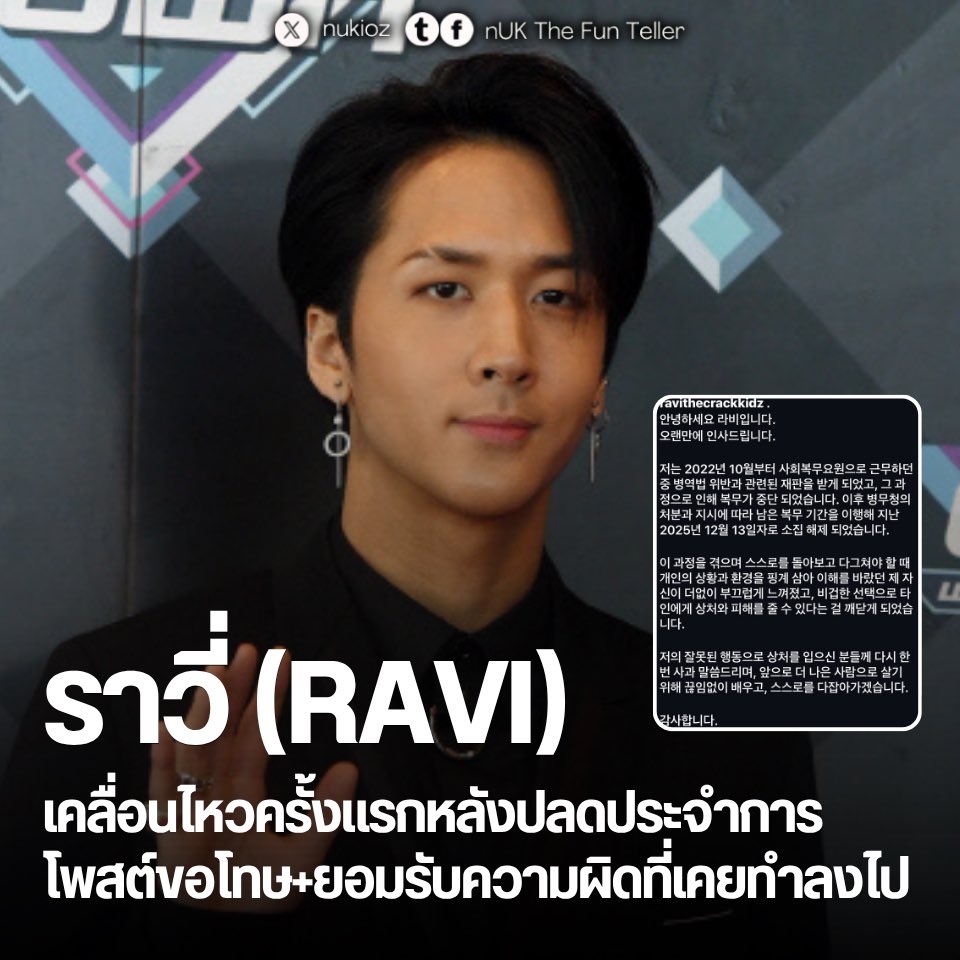 #Ravi released an official apology for the first time since being discharged on 13 Dec 2025, for his wrongdoings through his SNS. "Going through this process, I felt deeply ashamed of myself for using my personal circumstances and environment as an excuse to seek understanding at a time when I should have been reflecting on and pushing myself harder; I realised that such cowardly choices could cause pain and harm to others.ve been reflecting on and pushing myself harder; I realised that such cowardly choices could cause pain and harm to others."