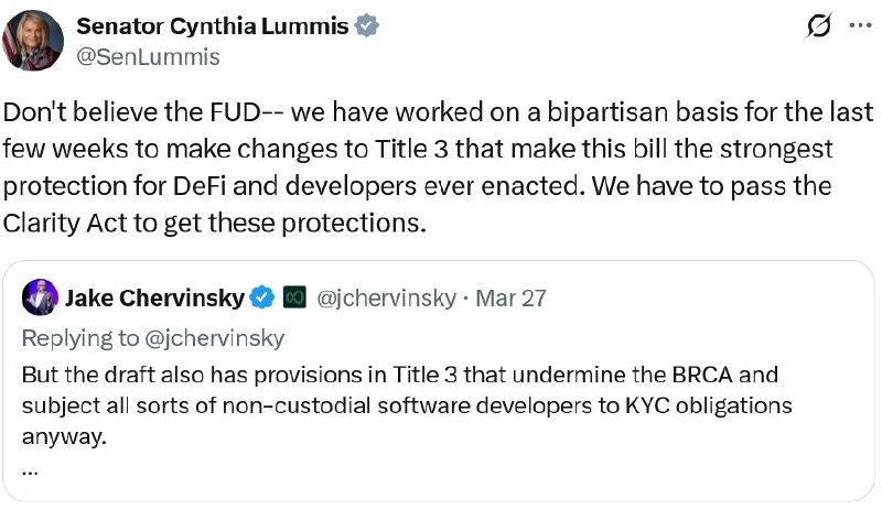 🇺🇲 Cynthia Lummis afirma que la Clarity Act ofrecerá las protecciones más sólidas para desarrolladores dentro del ecosistema cripto 💪📜