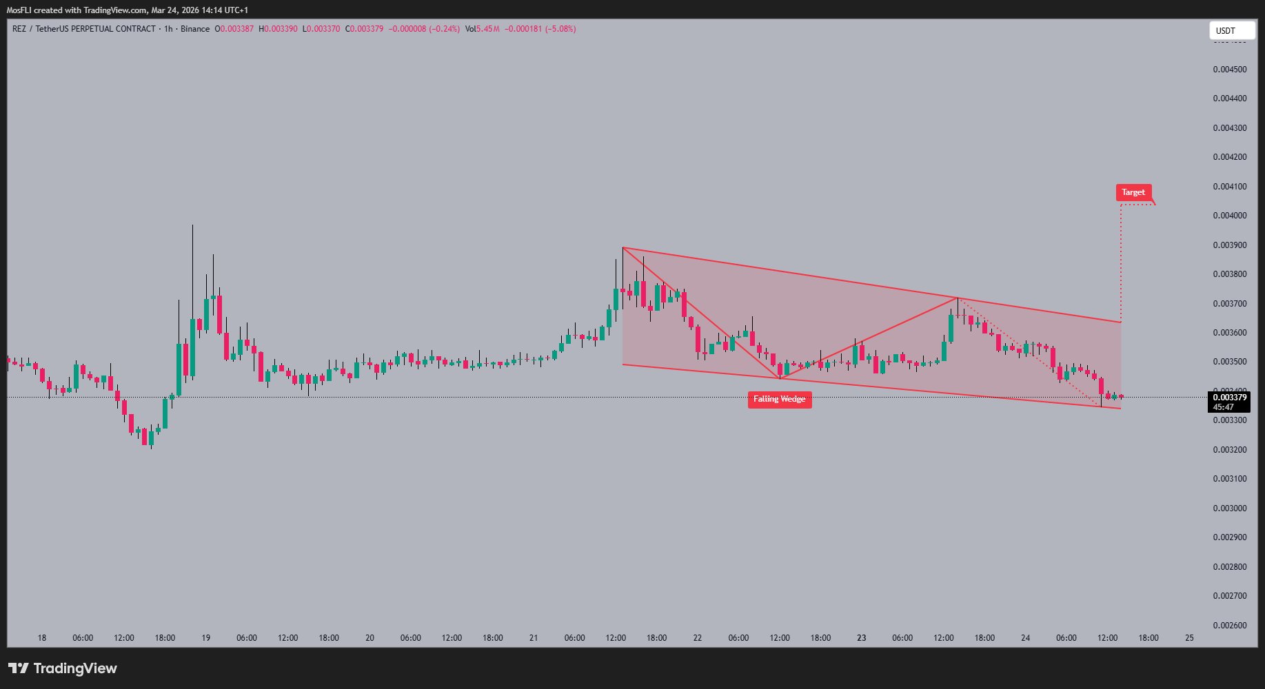 #REZ is currently trading within a falling wedge pattern 📉, showing a potential for a breakout. The falling wedge pattern 📐 suggests a period of consolidation before a possible bullish move. The next target after a breakout could be around 0.004100 🎯.