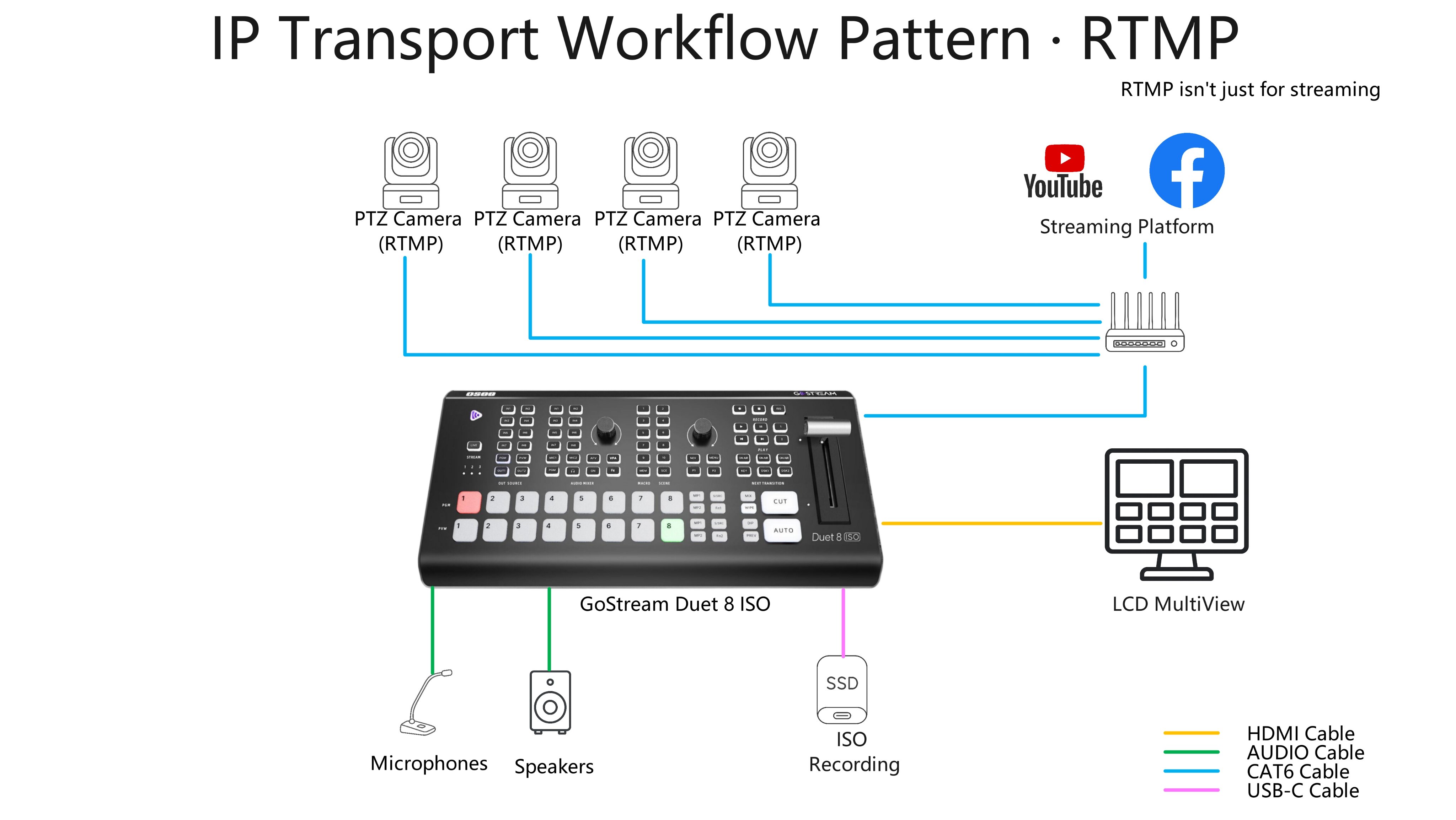 RTMPとは、Real-time messaging protocolの略で、Macromedia社(現Adobe社)によって開発されたリアルタイム通信プロトコルです。配信サーバーへ映像・音声データを送信する際の標準的なプロトコルとして広く利用されています。