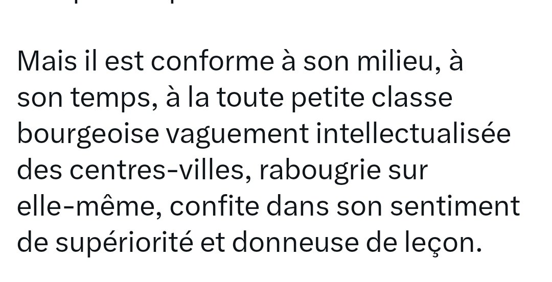 Mais il est conforme à son milieu, à son temps, à la toute petite classe bourgeoise vaguement intellectualisée des centres-villes, rabougrie sur elle-même, confite dans son sentiment de supériorité et donneuse de leçon.