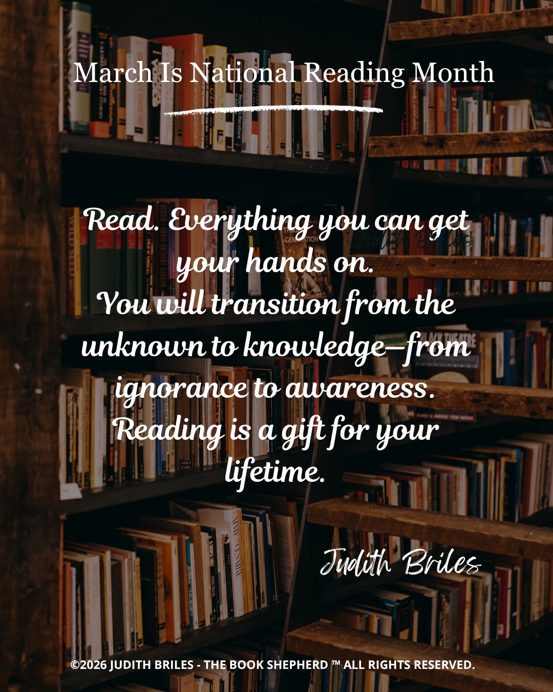 You will transition from the unknown to knowledge—from ignorance to awareness. Reading is a gift for your lifetime.