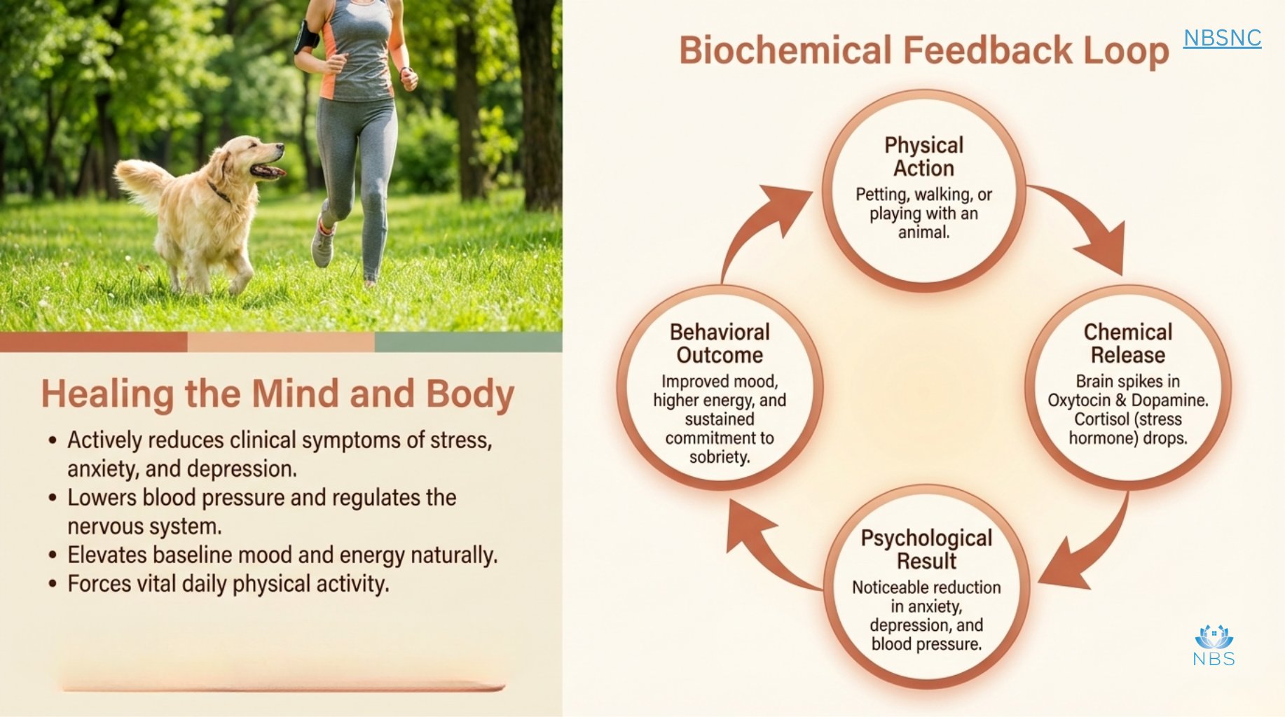 The "Biochemical Feedback Loop" shows how simple actions—like walking a dog—trigger Oxytocin & Dopamine while dropping Cortisol levels. Physical movement isn't just exercise; it’s a vital tool for a sober mind. 🐾🏃♀️