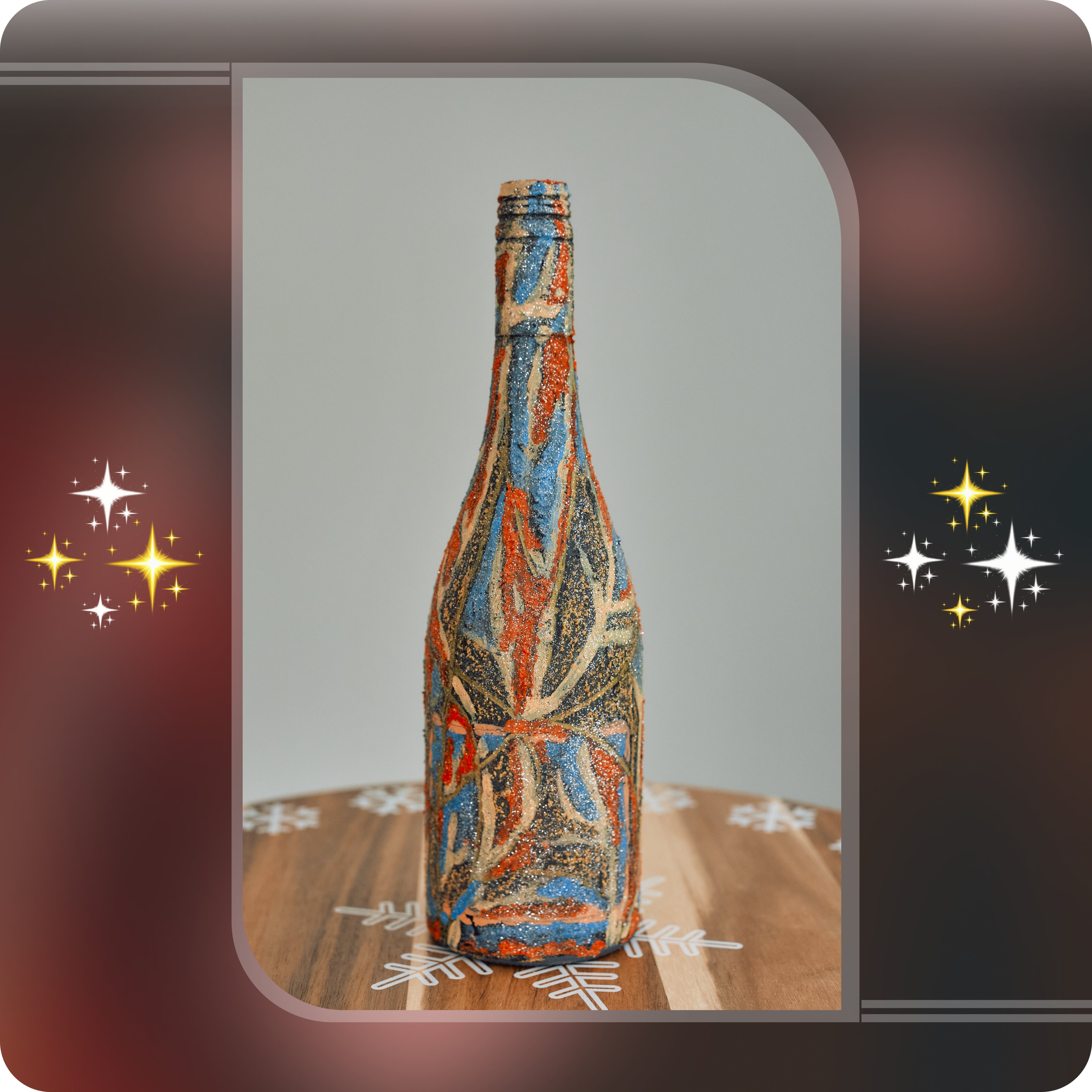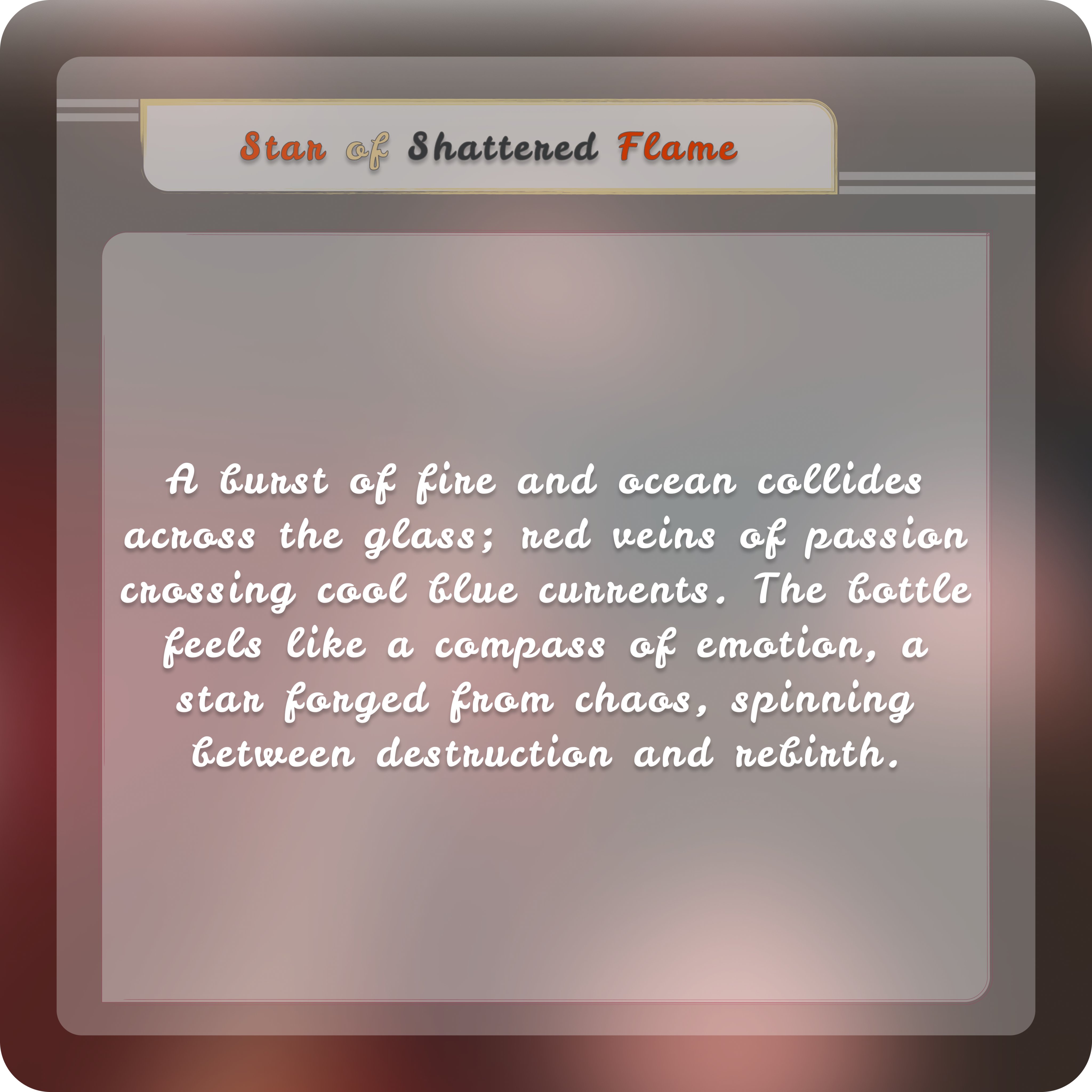 A burst of fire and ocean collides across the glass; red veins of passion crossing cool blue currents. The bottle feels like a compass of emotion, a star forged from chaos, spinning between destruction and rebirth.