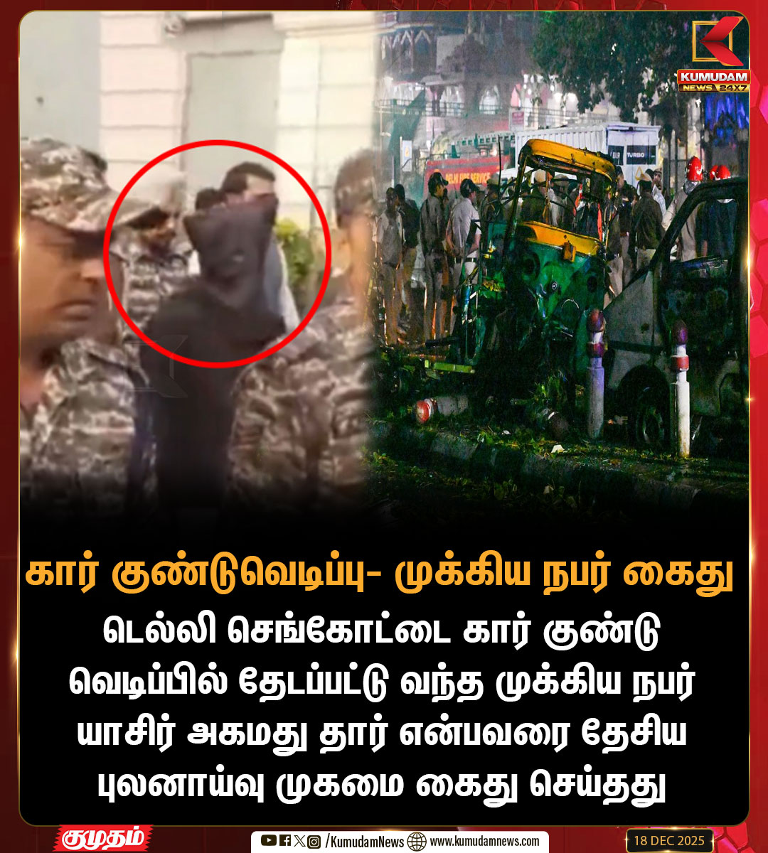 Kumudam News 24x7 @kumudamNews24x7 · Dec 18, 2025 செங்கோட்டை கார் குண்டுவெடிப்பு: முக்கிய நபர் கைது #RedFortExplosion | #DelhiCarBlast | #Delhi | #CarBlast | #YasirAhmedDar | #KumudamNews24x7 30