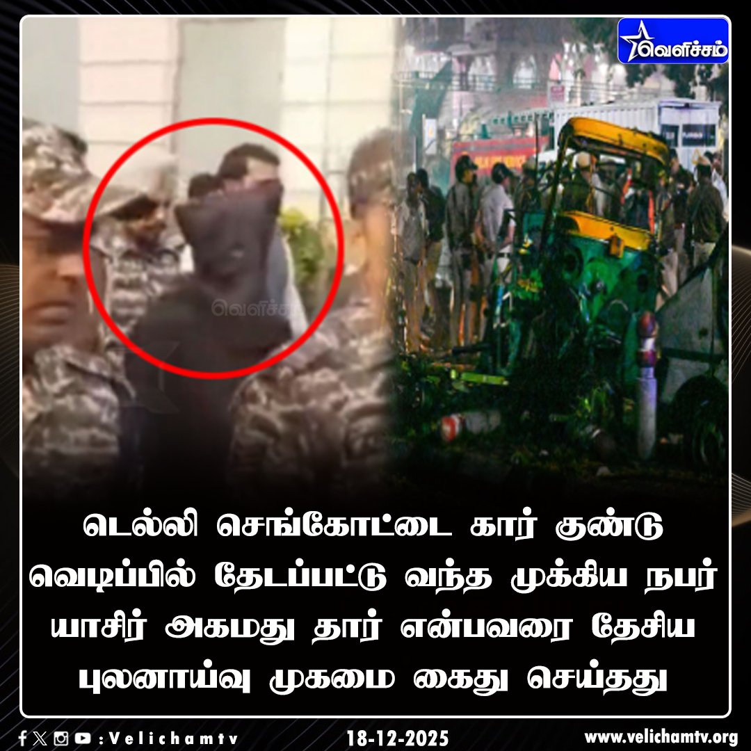 Velicham TV @velichamtvtamil · Dec 18, 2025 செங்கோட்டை கார் குண்டுவெடிப்பு: முக்கிய நபர் கைது #RedFortExplosion | #DelhiCarBlast | #Delhi | #CarBlast | #YasirAhmedDar | #VelichamTV 49