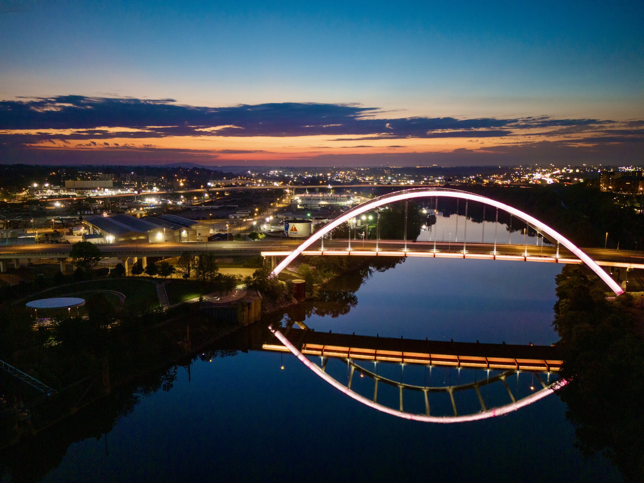 Reflect on Friday! Got any reflection photos in your gallery? Share em below ⬇️ Here’s a decent drone shot of the Cumberland River in Nashville at dawn.