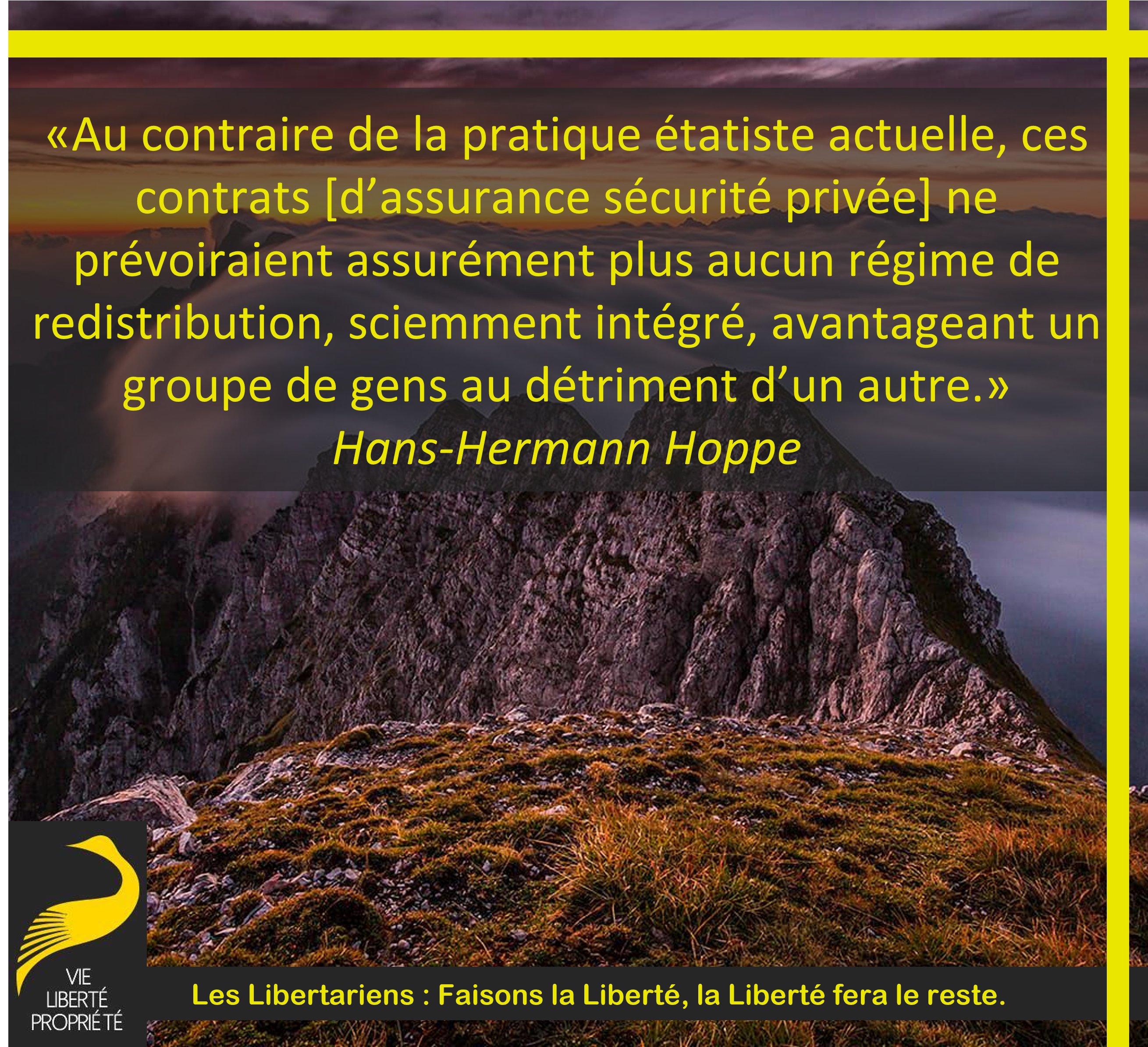 Au contraire de la pratique étatiste actuelle, ces contrats [d’assurance sécurité privée] ne prévoiraient assurément plus aucun régime de redistribution, sciemment intégré, avantageant un groupe de gens au détriment d’un autre.