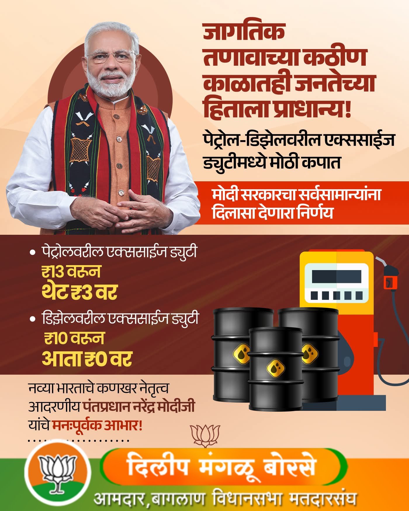 पंतप्रधान श्री. नरेंद्र मोदीजींच्या सरकारने पेट्रोल आणि डिझेलवरील एक्साईज ड्युटीमध्ये मोठी कपात करून भारतीयांना खूप मोठा दिलासा दिला आहे. महागाईवर मात करण्यासाठी उचललेले हे एक ऐतिहासिक पाऊल!