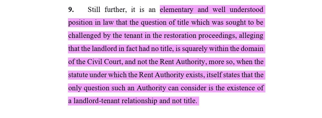 SC: Rent Authority’s jurisdiction is limited to determining landlord-tenant relationship. Questions of title fall within Civil Court’s domain, especially when governing statute restricts Rent Authority to tenancy matters, not ownership disputes. #SupremeCourt #RentControl