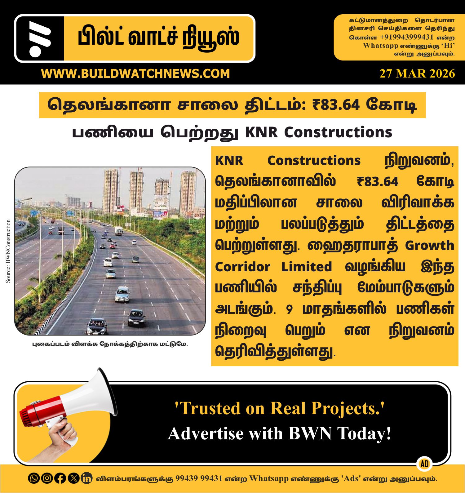 BuildWatch News Tamil @bwntamil · 1d *தெலங்கானா சாலை திட்டம்: ₹83.64 கோடி பணியை பெற்றது KNR Constructions* #KNRConstructions #Telangana #RoadProject #InfrastructureProjects #ConstructionSector #HighwayDevelopment #ProjectAward #InfrastructureGrowth 23