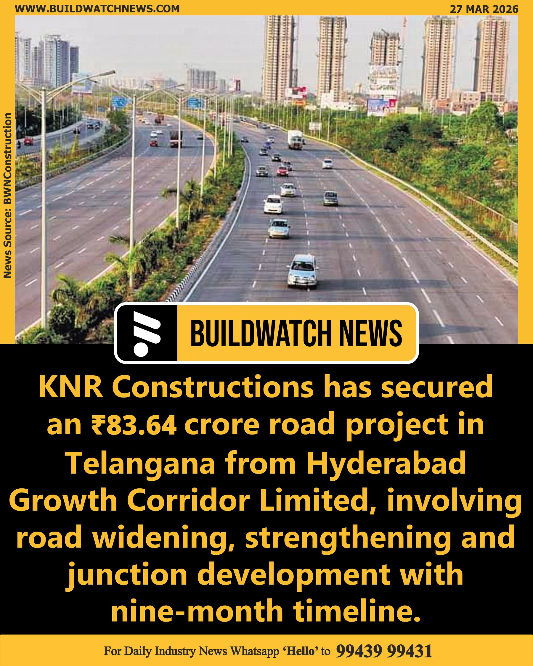 Buildwatch Media @BuildWatchNEWS · 1d KNR Constructions bags ₹83.64 crore road project in Telangana 🔗Read more:buildwatchnews.com/knr-constructi…3 #KNRConstructions #Telangana #RoadProject #InfrastructureProjects #ConstructionSector #HighwayDevelopmenta 28