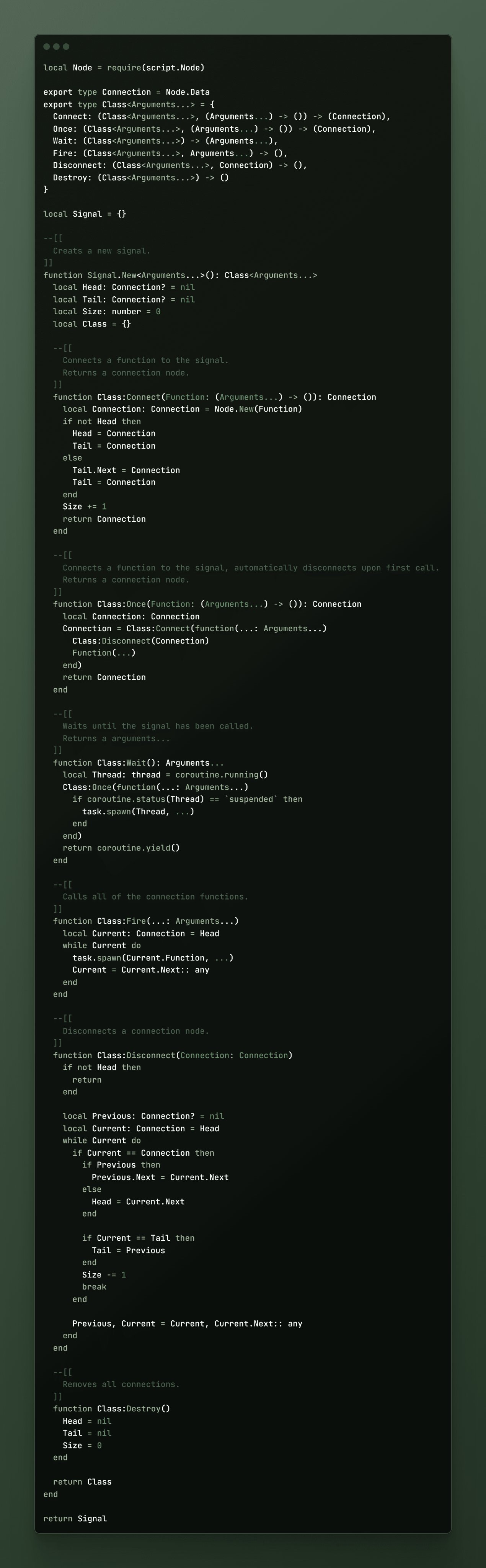 I've fiddled around with custom RBXScriptSignals in Roblox for a while now, this is one I've been attached to the most due to its simplicity and type annotation.