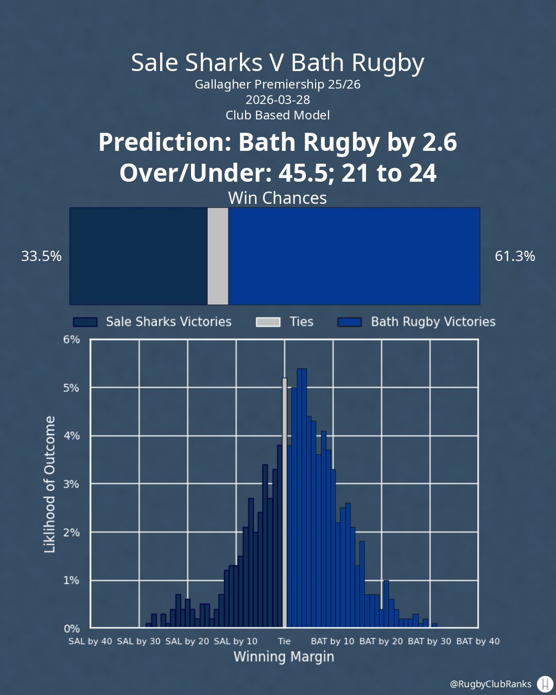 Sale Sharks hosts Bath Rugby on Saturday, March 28th. Here's my prediction from the club model, not accounting for lineups.