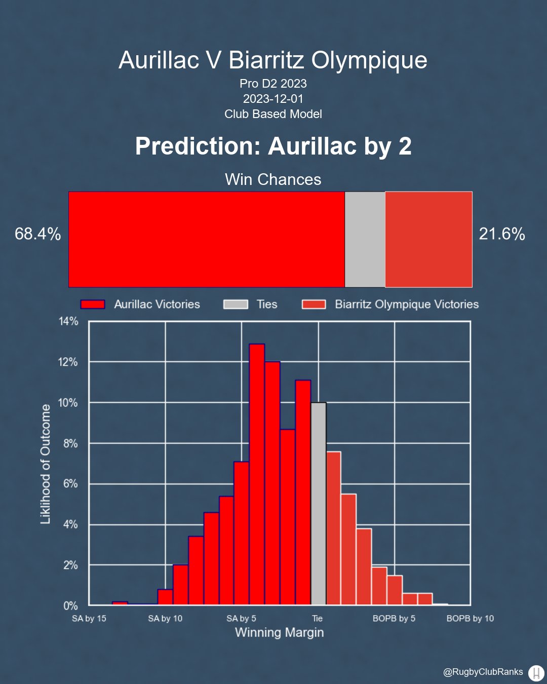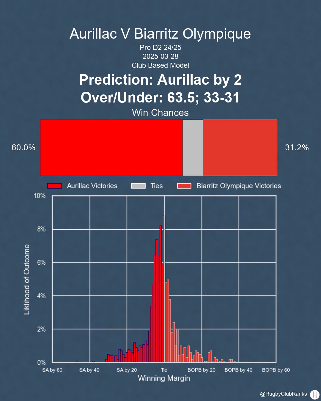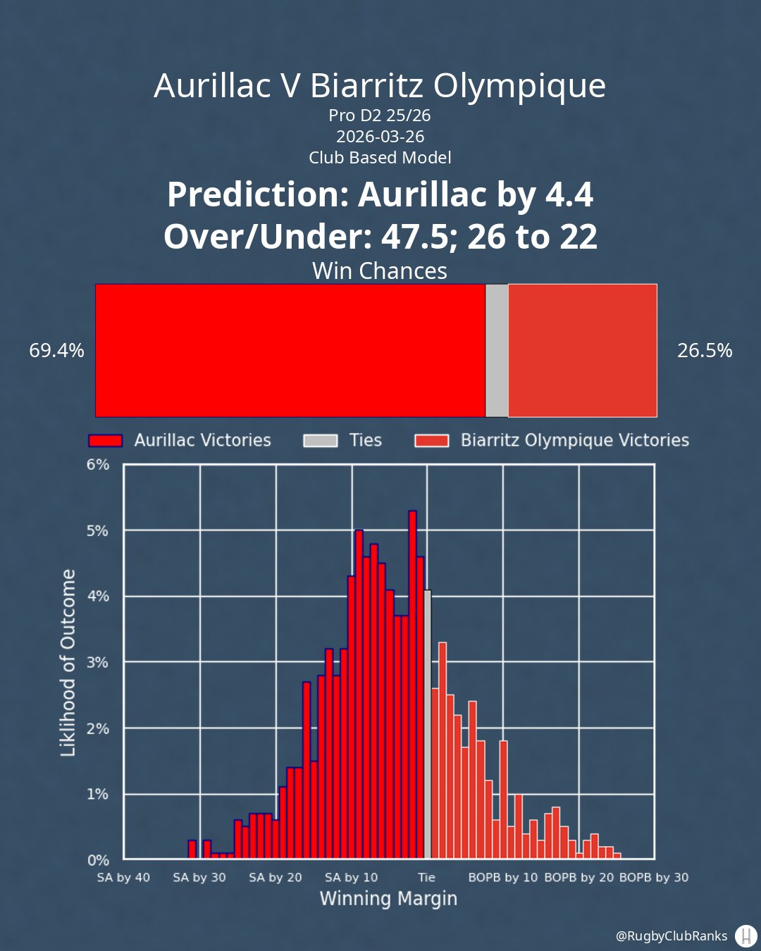 Aurillac hosts Biarritz Olympique on Thursday, March 26th. Here's my prediction from the club model, not accounting for lineups.