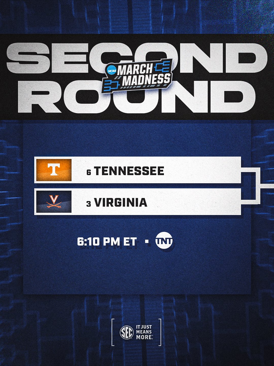 Southeastern Conference @SEC Β· 5d Game time in Philly! SECOND ROUND π§ No. 6@Vol_Hoops vs. No. 3 Virginia πΊ TNT #SECMBB @x @MarchMadnessMBmE 2 47 10.5K