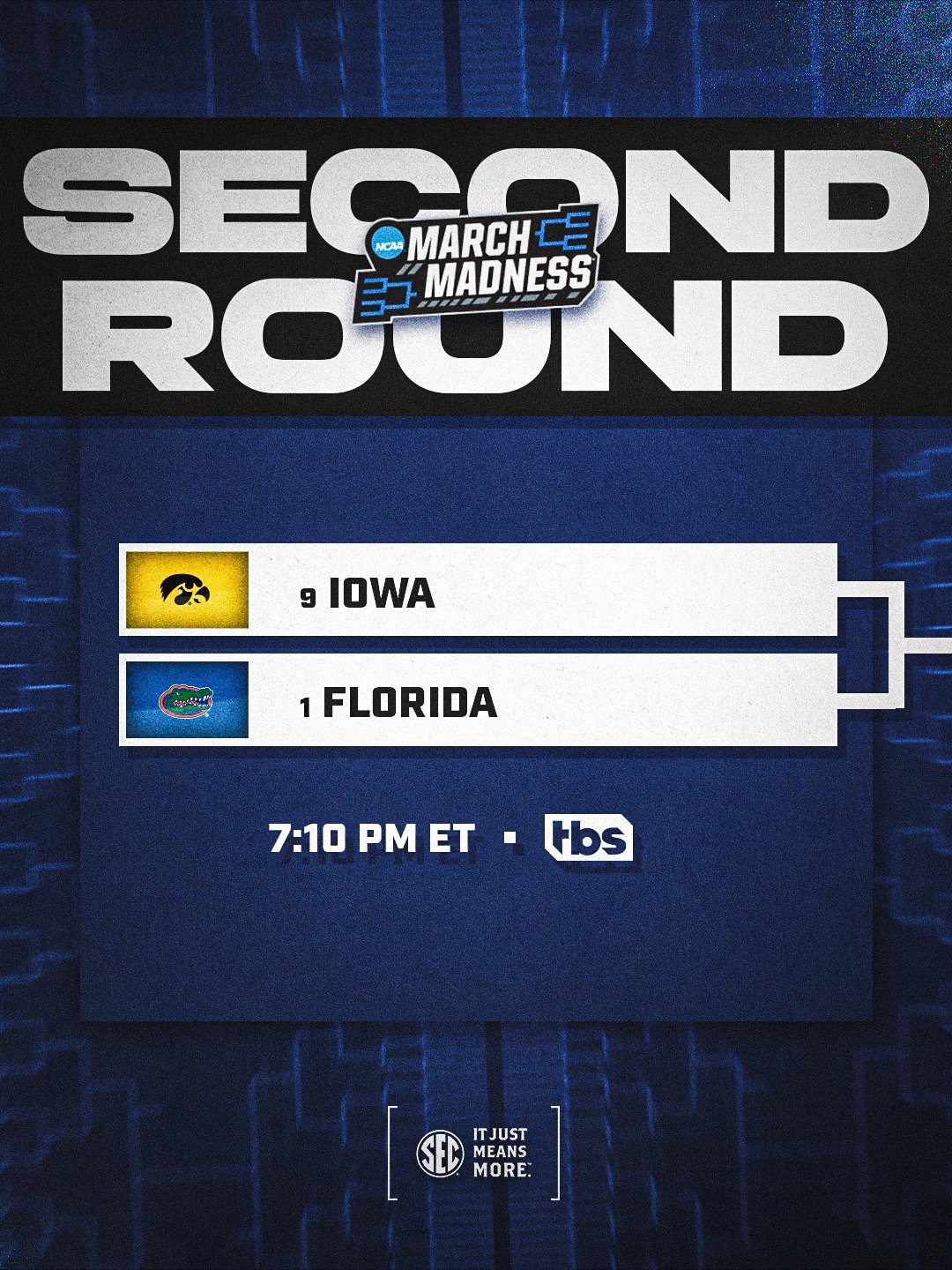Southeastern Conference @SEC Β· 5d Let's go Gators π SECOND ROUND π No. 9 Iowa vs. No. @1 @GatorsMBK πΊ TBS #SECMBB@x @MarchMadnessMmMQ 2 13 9.7K
