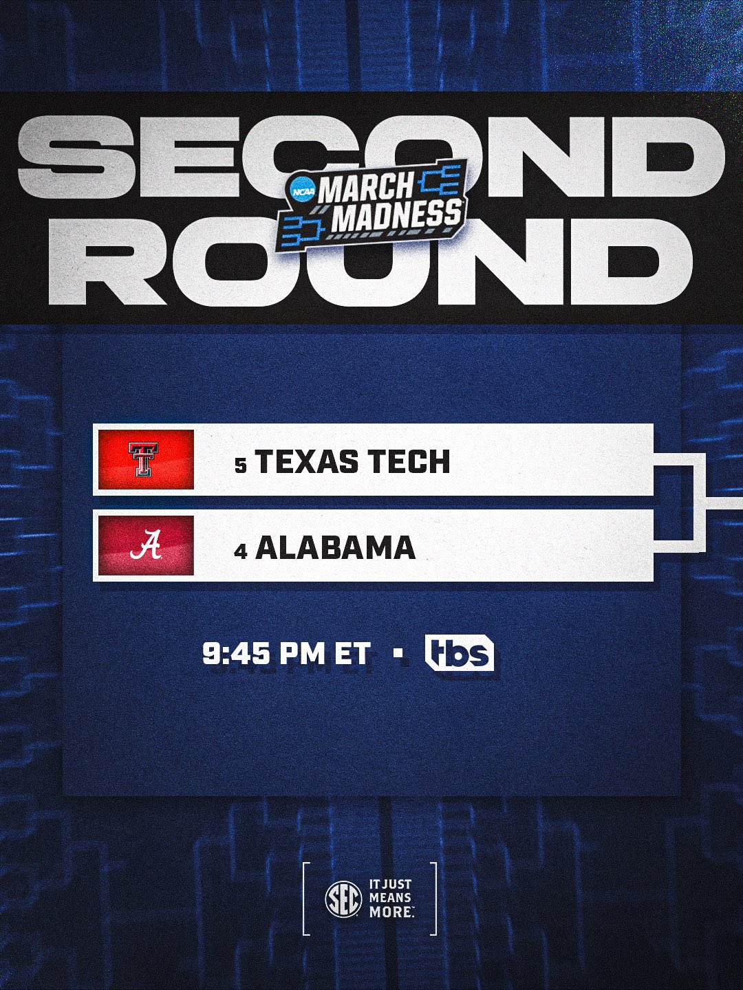 Southeastern Conference @SEC Β· 5d Closing out the night! SECOND ROUND π No. 4@AlabamaMBB vs. No. 5 Texas Tech πΊ TBS #SECMBB @x @MarchMadnessMBAb 1 2 30 12.3K