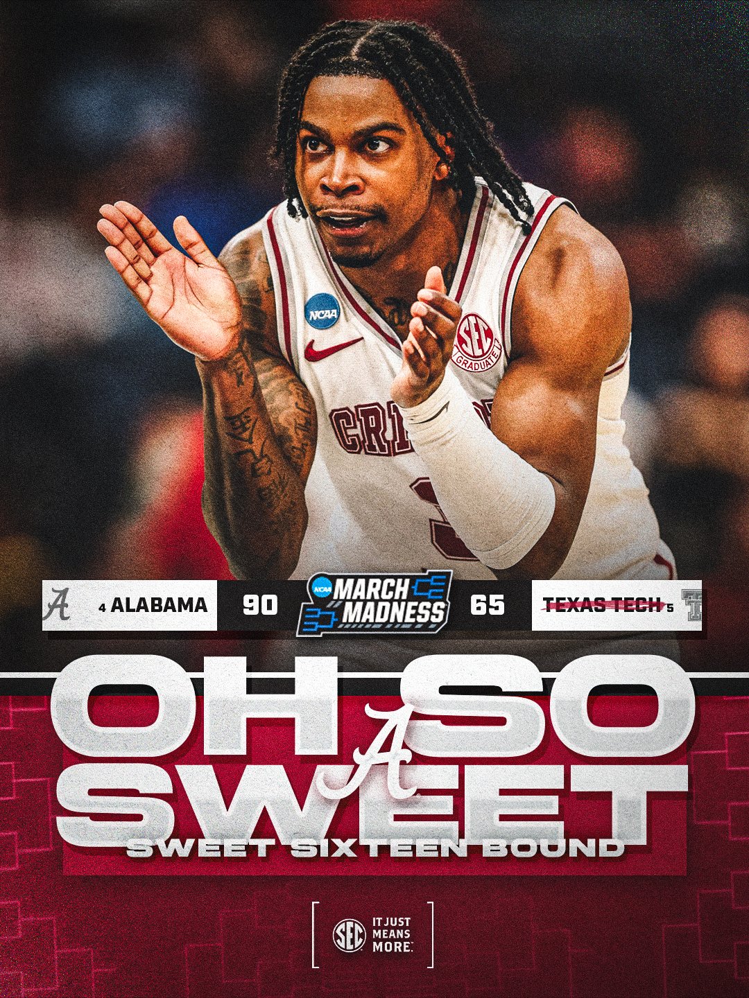 Southeastern Conference @SEC Β· 5d ALL BAMA TONIGHT β¨οΈ @AlabamaMBB cruises past No. 5 Texas Tech to advance to their FOURTH CONSECUTIVE SWEET 16! #SECMBB x @MarchMadnessMBB 1 88 772 17.2K