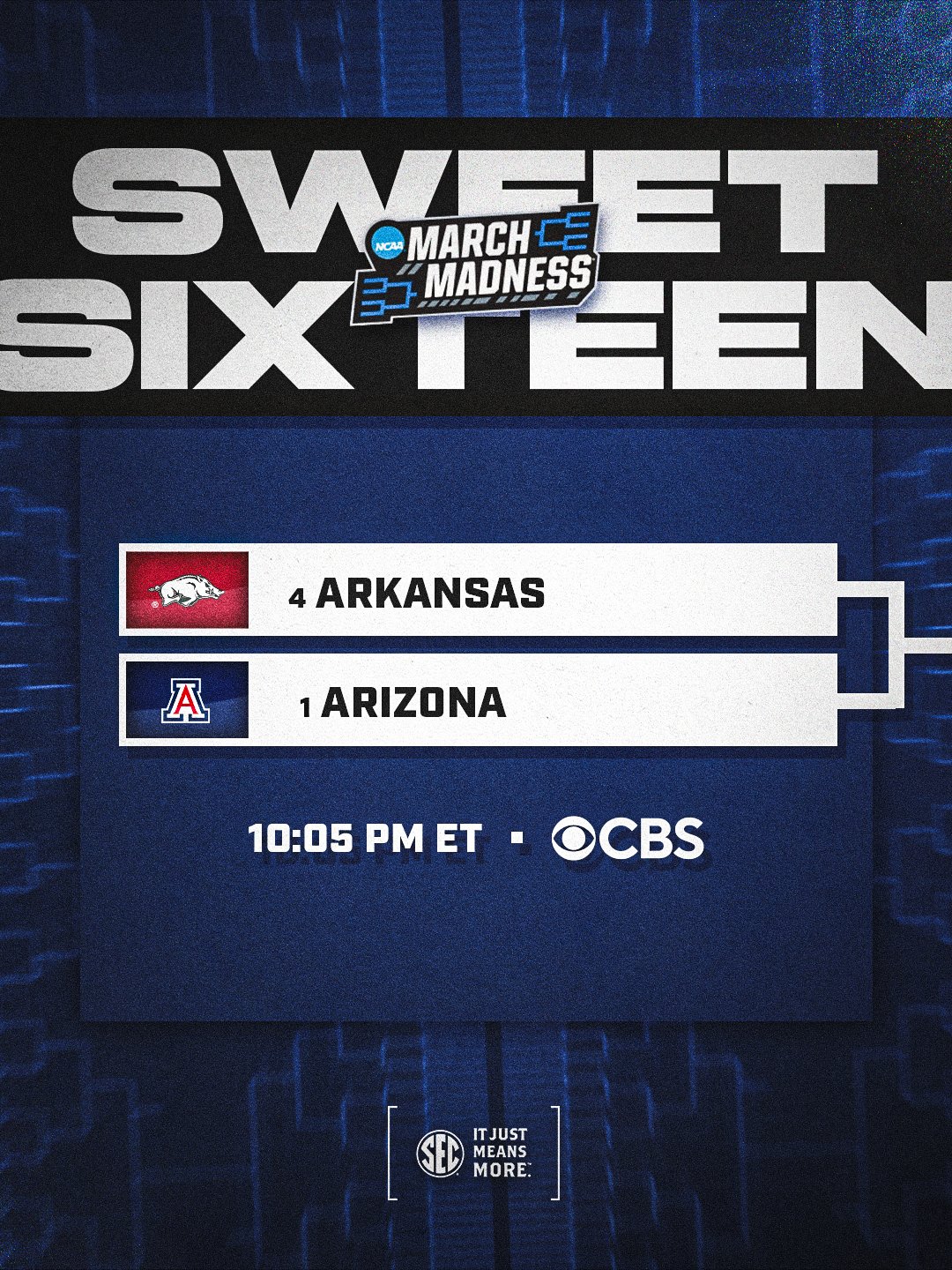 Southeastern Conference @SEC Β· 1d Hogs locked in π SWEET SIXTEEN π No. @4 @RazorbackMBB vs. No. 1 Arizona πΊ CBS #SECMBB@x @MarchMadnessMLg3 2 5 46 10.7K