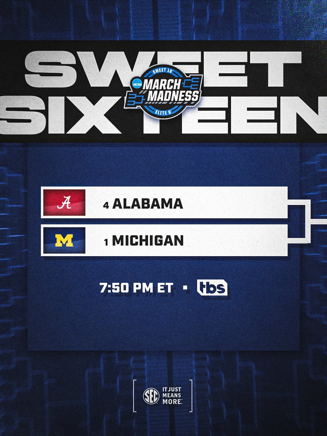 Southeastern Conference @SEC Β· 8h time to let it roll π SWEET SIXTEEN π No. @4 @AlabamaMBB vs. No. 1 Michigan πΊ TBS #SECMBB@x @MarchMadnessMoDa 3 18 7.9K