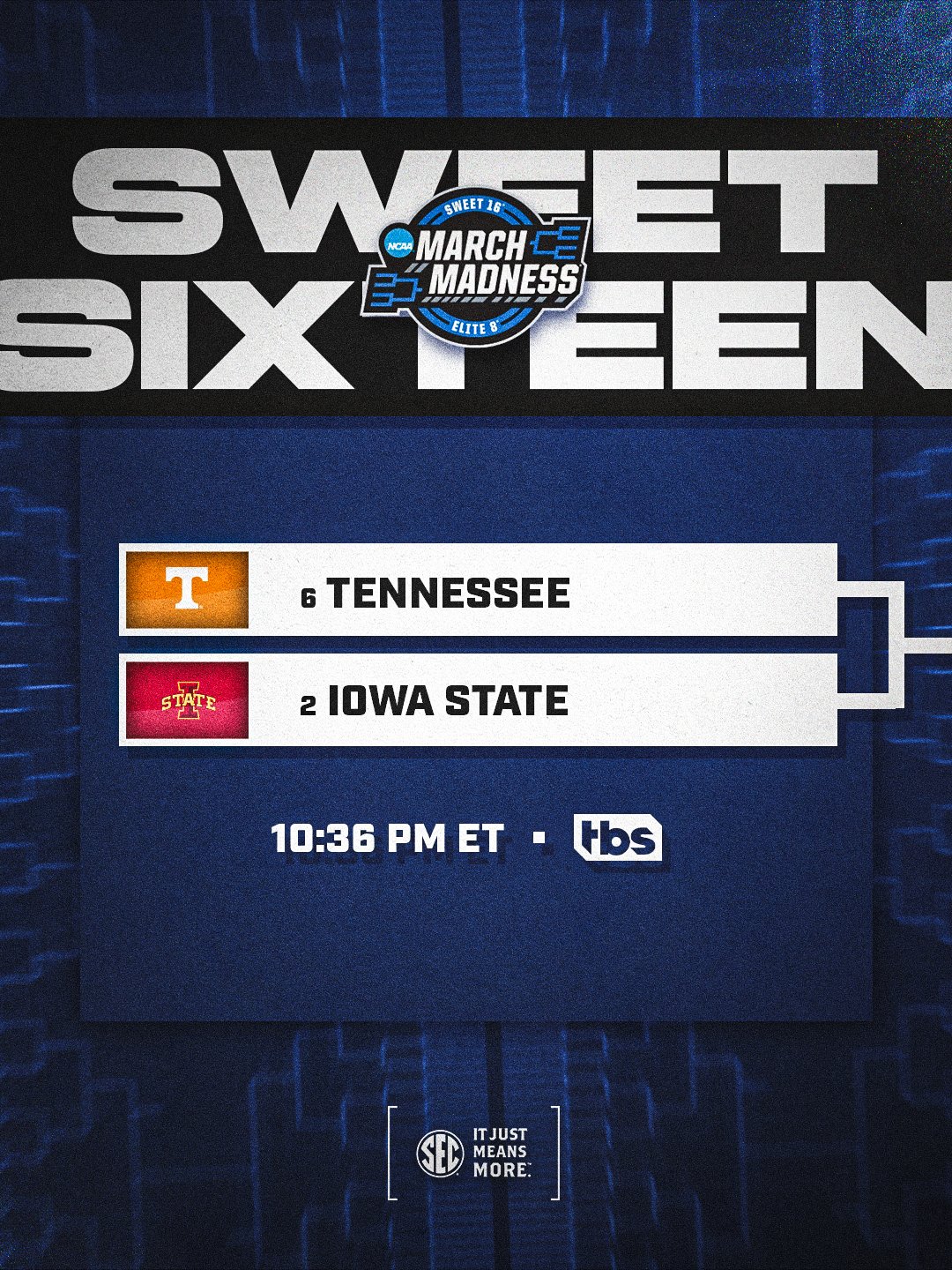 Southeastern Conference @SEC Β· 5h Off and running in Chicago! SWEET SIXTEEN π§ No. 6@Vol_Hoops vs. No. 2 Iowa State πΊ TBS #SECMBB @x @MarchMadnessMBWD 2 10 8.5K