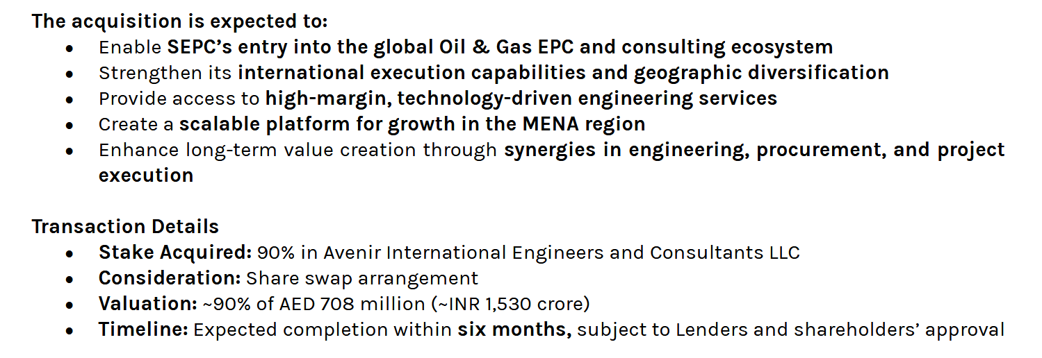 SEPC to acquire 90% stake in Avenir International Engineers and Consultants LLC, Abu Dhabi, enabling expansion into the MENA Oil & Gas EPC space; transaction valued at ~AED 708 million (INR 1,530...