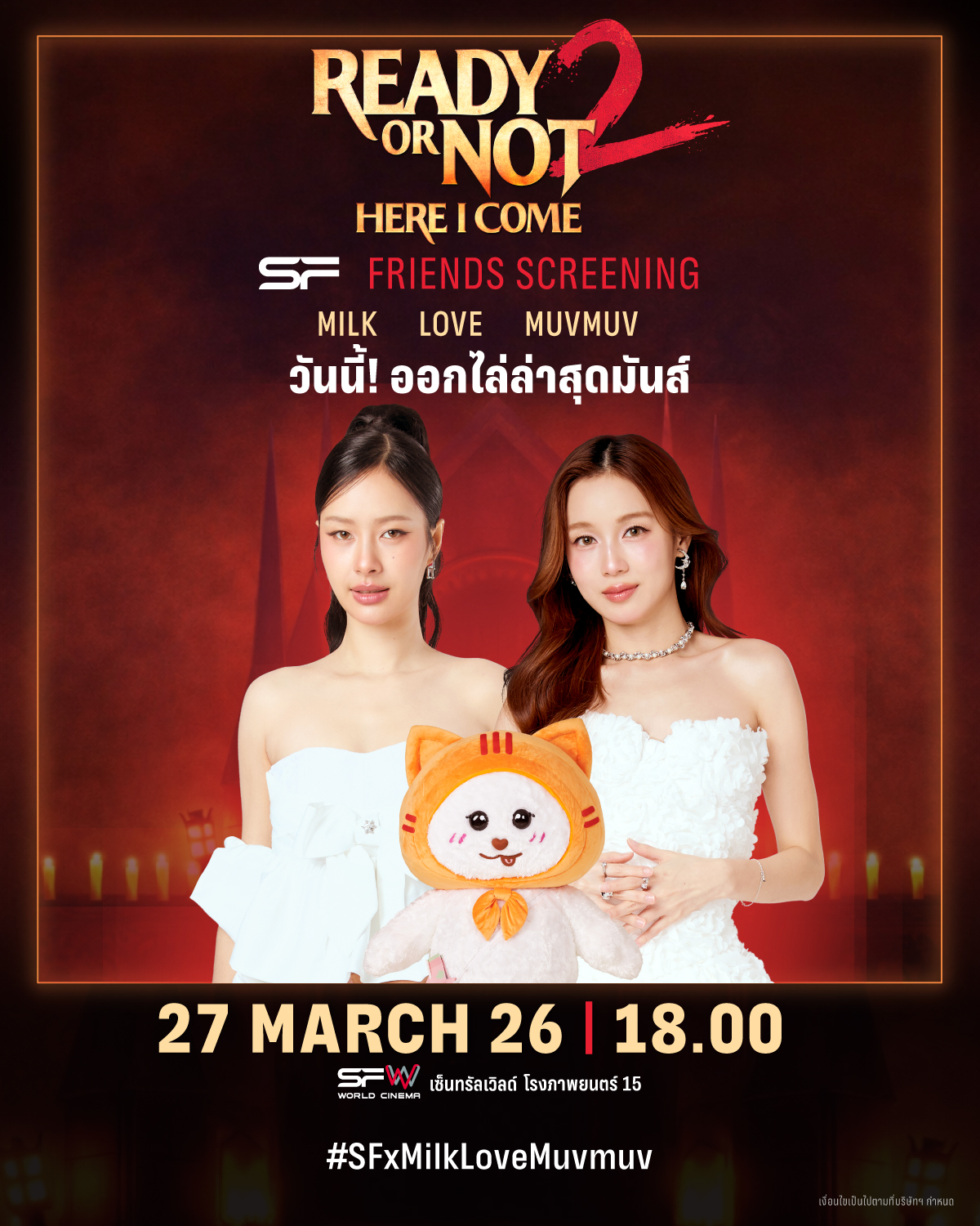 SF Cinema @WeLoveSF · 1d 🪓วันนี้! ออกไล่ล่าสุดมันส์ ไปกับ MILK, LOVE, MUVMUV ในรอบพิเศษ #SFFriendsScreening Ready or Not: Here I Come ที่ SFW เซ็นทรัลเวิลด์ 📢มาแชร์โมเมนต์ความมันส์ พร้อมติด 👉 #️⃣ SFxMilkLoveMuvmuv #MilkPansa #loverrukk #MUVMUV #SFxReadyOrNot2 #ดูหนังที่SF #SFcinema 2EF0 1 500 850 11.5K