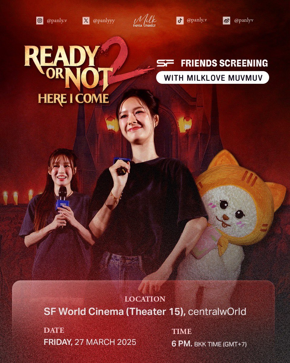 Milk_family @milkfamily__ · 1d Milk's Schedule 🐈⬛💚 SF Friends Screening With MilkLove 🎬 READY OR NOT 2… HERE I COME! #SFFriendsScreening #MilkPansa #loverrukk #MUVMUV #SFxReadyOrNot2 #ดูหนังที่SF #SFcinema 🍿❤ 🗓 March 27, 2025 🕰️ 6.00 PM (Bkk Time) 📌 SF World Cinema (Theater 15), Centralsfcinema.co/SFF_RoN2AqtNjIWu 🎟 บัตรราคาที่นั่งละ 800 บาท (รวมค่าธรรมเนียมการออกบัตร) 🍿รับฟรี! POPCORN M 1 กล่อง 72 106 4.9K