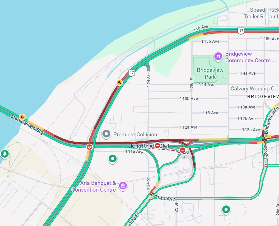 ⛔️#BCHwy17 - the highway is closed in both directions between Tannery Rd and Bridgeview Dr until 5:00am Monday 30 March due to construction.