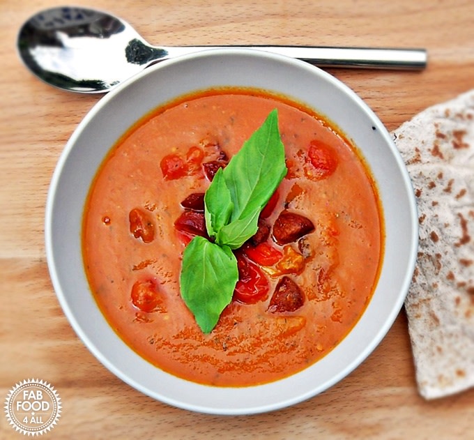 From fabfood4all.co.ukRoasted Tomato, Red Pepper & Chorizo Soup is an intensely flavoursome soup. Made with roasted tomatoes, peppers, fried chorizo, & basil with a sweet sharp edge courtesy of lemon juice & brown sugar.