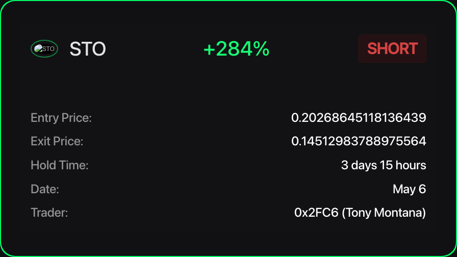 Whale Trade Alerts @WhaleTradeAlert · May 6, 2025 0x2FC6 (Tony Montana) from our group achieved 284% profit with STO SHORT. 📈 FREE Whale Tracker:t.me/whale_visionq $STO #STO #STOUSD #STOUSDTs 153