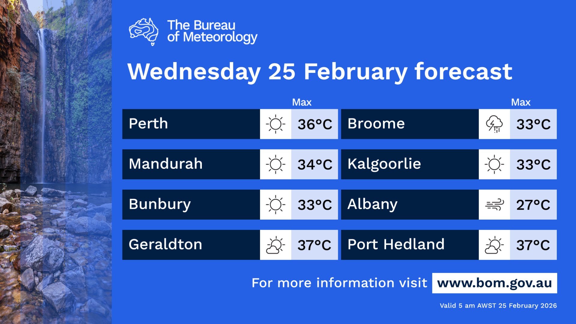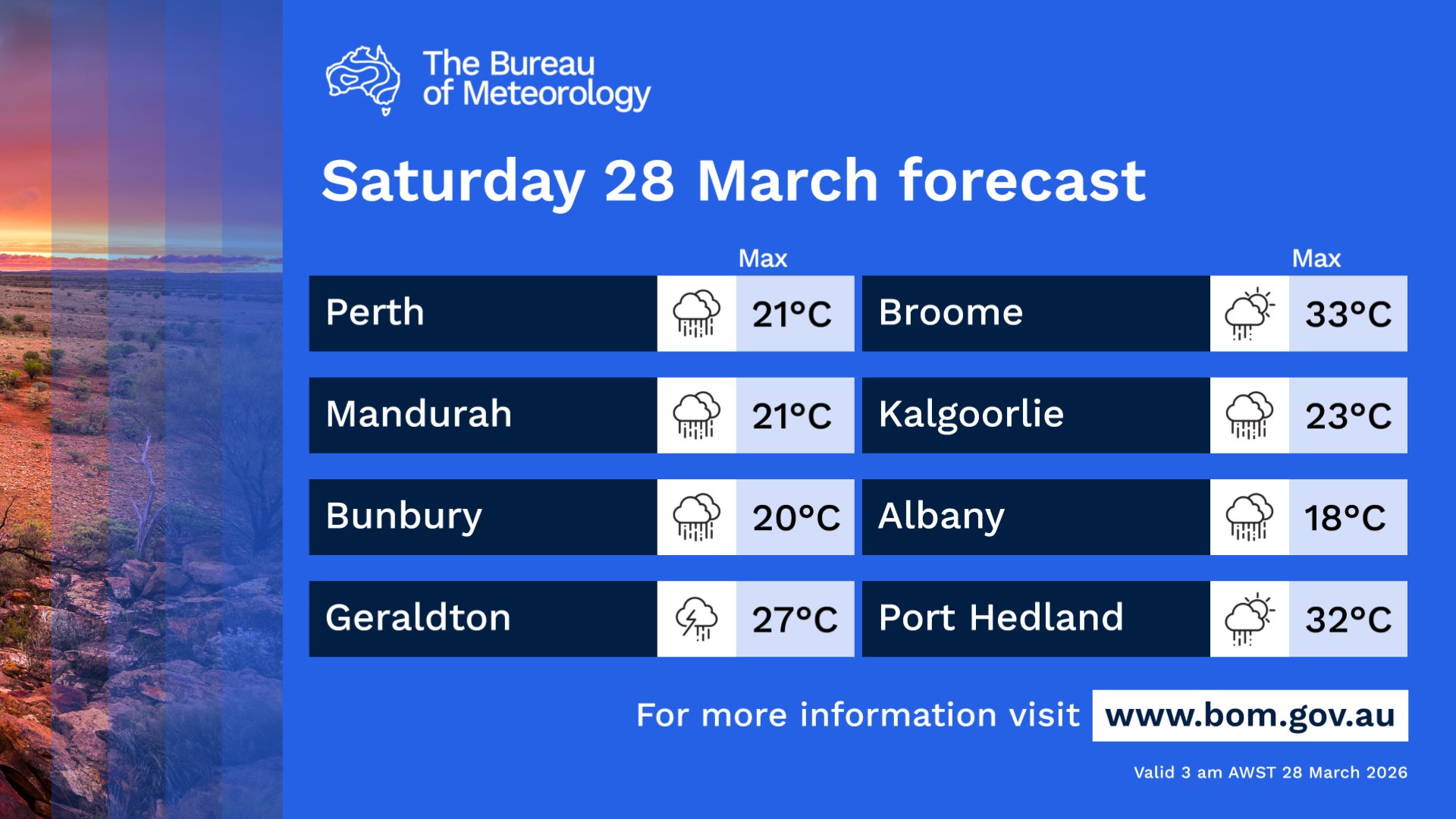 Very windy, rain, gusty thunderstorms and heavy falls possible over #Gascoyne, #SWLD. Showers, gusty thunderstorms west #Kimberley, #Pilbara, #Goldfields, west #Interior, west #Eucla. Windy over central and southern areas.