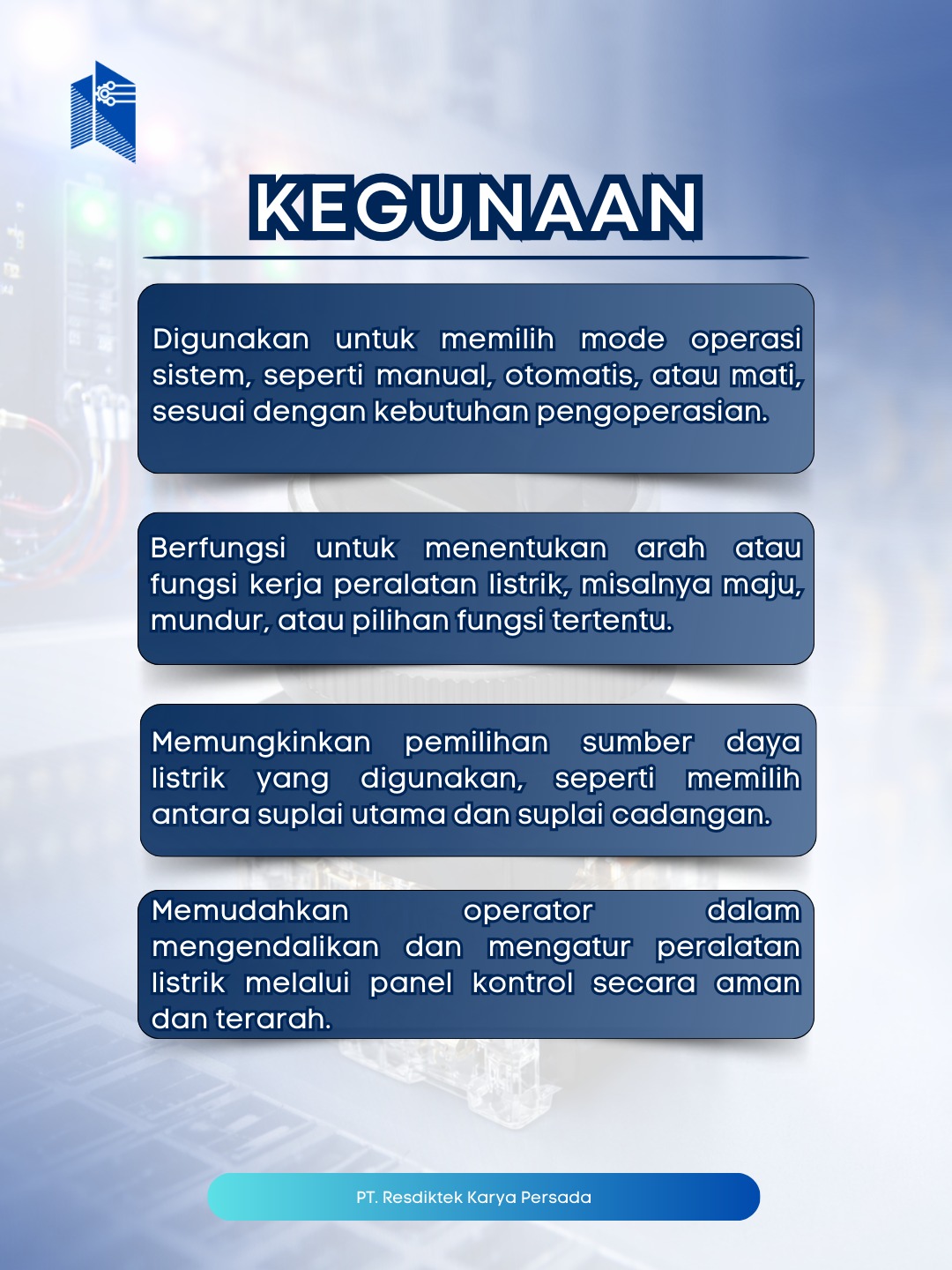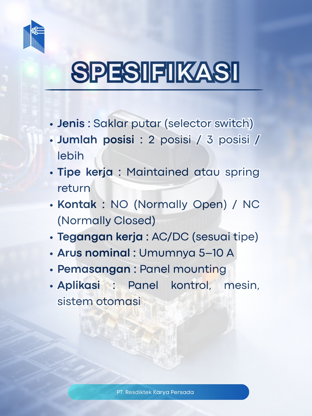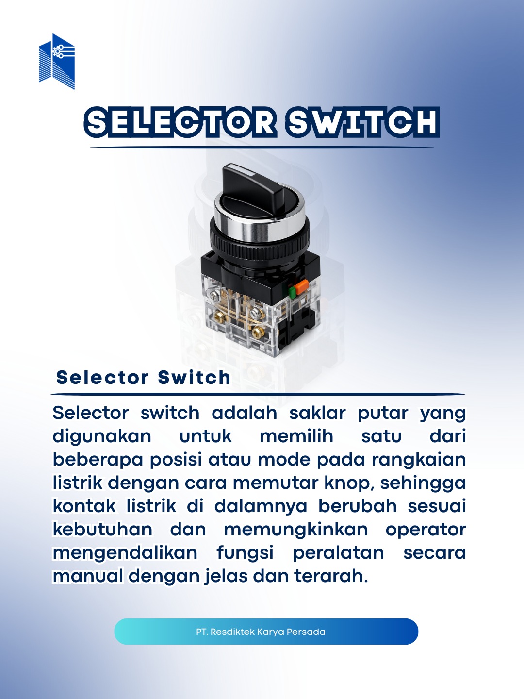 Selector switch memudahkan pemilihan mode kerja mesin hanya dengan satu putaran. Kontrol jadi lebih jelas, aman, dan efisien, sekaligus mencegah kesalahan operasi pada panel listrik industri.