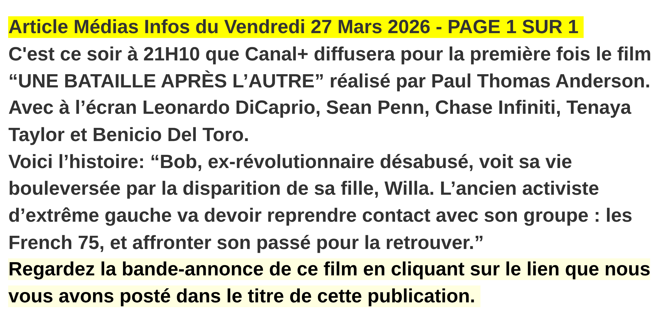 C'est ce soir à 21H10 que @Canalplus diffusera pour la première fois le film #UneBatailleAprèsLautre avec #LeonardoDiCaprio et #SeanPenn. Retrouvez notre article ci-dessous et regardez la bande-annonce en cliquant ici: youtube.com/watch?v=INhYOz…
