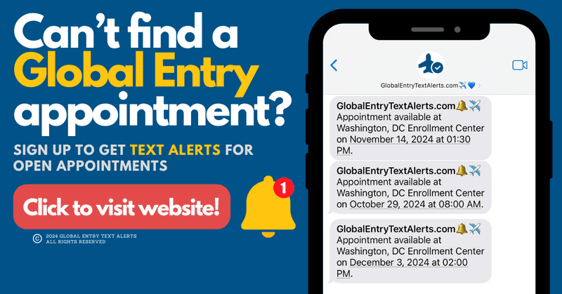 Global Entry Text Alerts @globalEntryText · 5d Global Entry appointments hard to come by? 🤔 Let us do the work for you! Our text alerts will notify you as soon as new appointments pop up. ✈️ 🛬 GlobalEntryTextAlerts.com. #SecurityCheck The solution to finding a Global Entry appointment! Get instant text message alerts when Global Entry appointments open up near you. Sign up now! From globalentrytextalerts.com 4