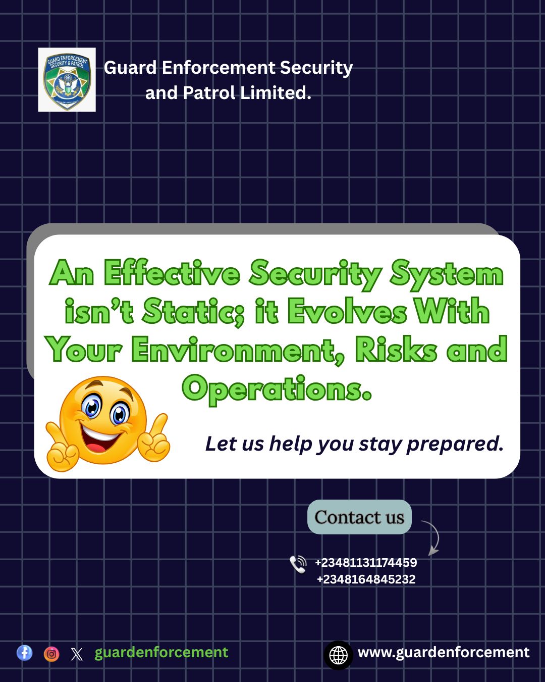 Guard Enforcement Security & Patrol Limited @gesp_LTD · 3d Stay ready, stay protected, stay ahead. 🛡 Guardenforcement has gat you covered 👌 #GuardEnforcement #StayReady #SecurityCheck #BeDifferent #Securitysolutionsxq