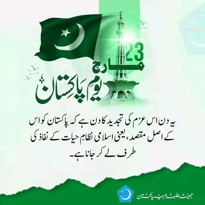 Hafiz Usman @HafizUsman89056 · 5d 23 مارچ یوم پاکستان یہ دن اس عزم کی تجدید کا دن ہے کہ پاکستان کو اس کے اصل مقصد، یعنی اسلامی نظامِ حیات کے نفاذ کی طرف لے کر جانا ہے۔ #Session2026 #23Martch 14