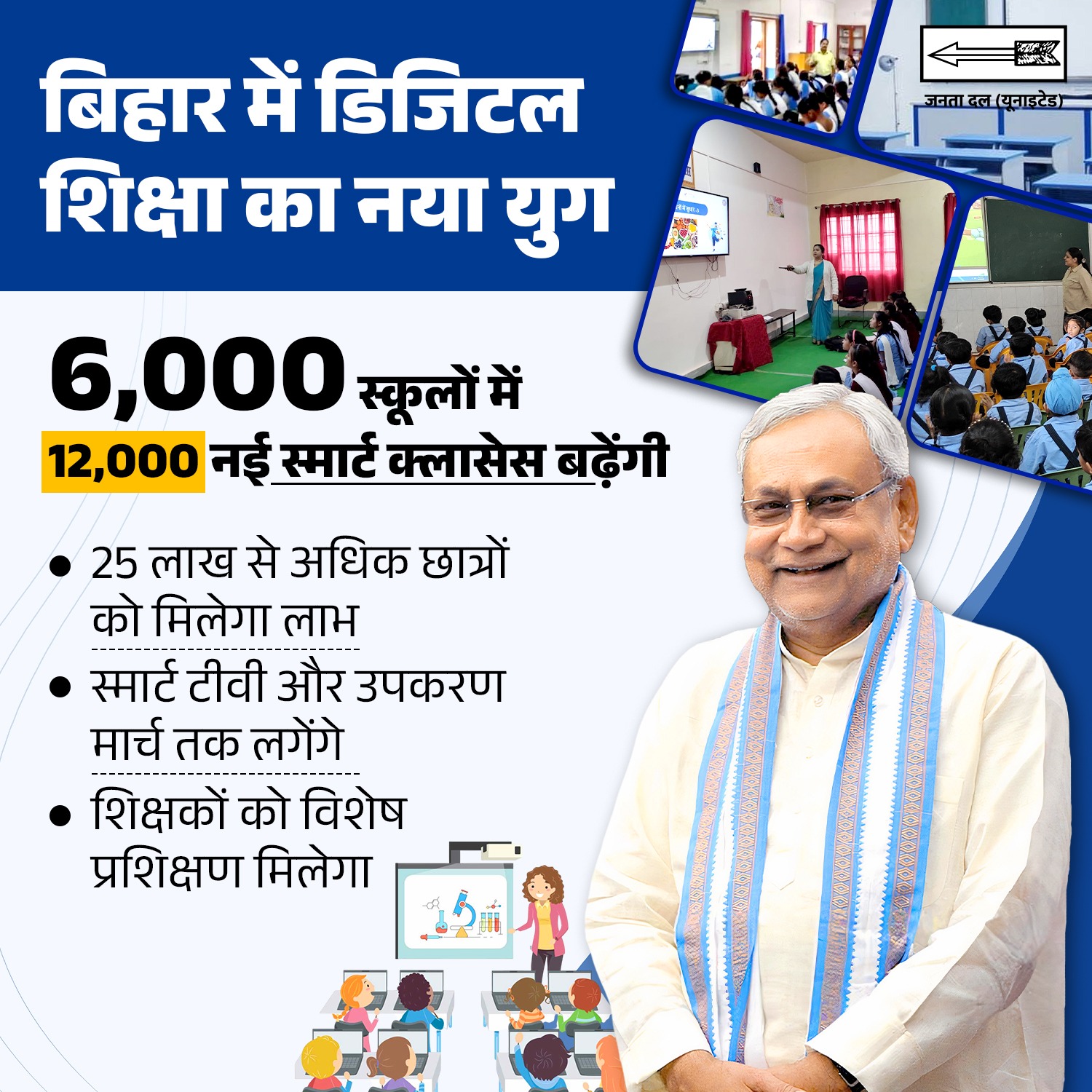 6,000 विद्यालयों में 12,000 नई स्मार्ट कक्षाओं की स्थापना की जा रही है। 25 लाख से अधिक छात्र-छात्राओं को आधुनिक शिक्षण सुविधाओं का लाभ मिलेगा तथा शिक्षकों को विशेष प्रशिक्षण प्रदान किया जाएगा।