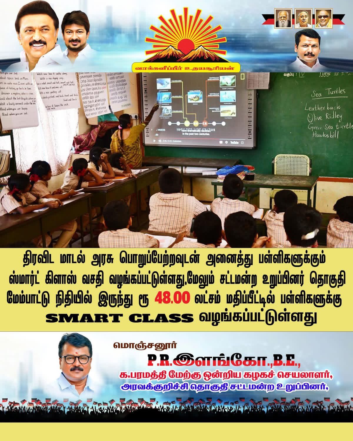 கல்வியே சிறந்த ஆயுதம்! திராவிட மாடல் அரசின் சீரிய முயற்சியால் பள்ளிகளில் ஸ்மார்ட் கிளாஸ் வசதி!சட்டமன்ற உறுப்பினர் மேம்பாட்டு நிதி ₹48.00 லட்சம் செலவில் பள்ளிகளுக்கு நவீன தொழில்நுட்ப வசதிவழங்கப்பட்டுள்ளது.