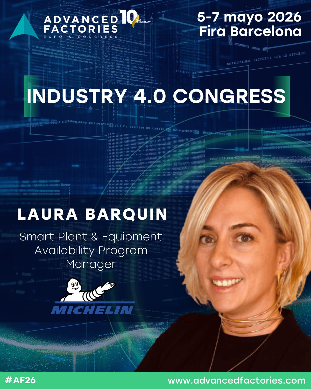 🎤 Laura Barquín Herrero, Responsable de Programas Digitales Manufacturing en Michelin, participará en el Industry 4.0 Congress de #AF26 junto a +420 expertos.