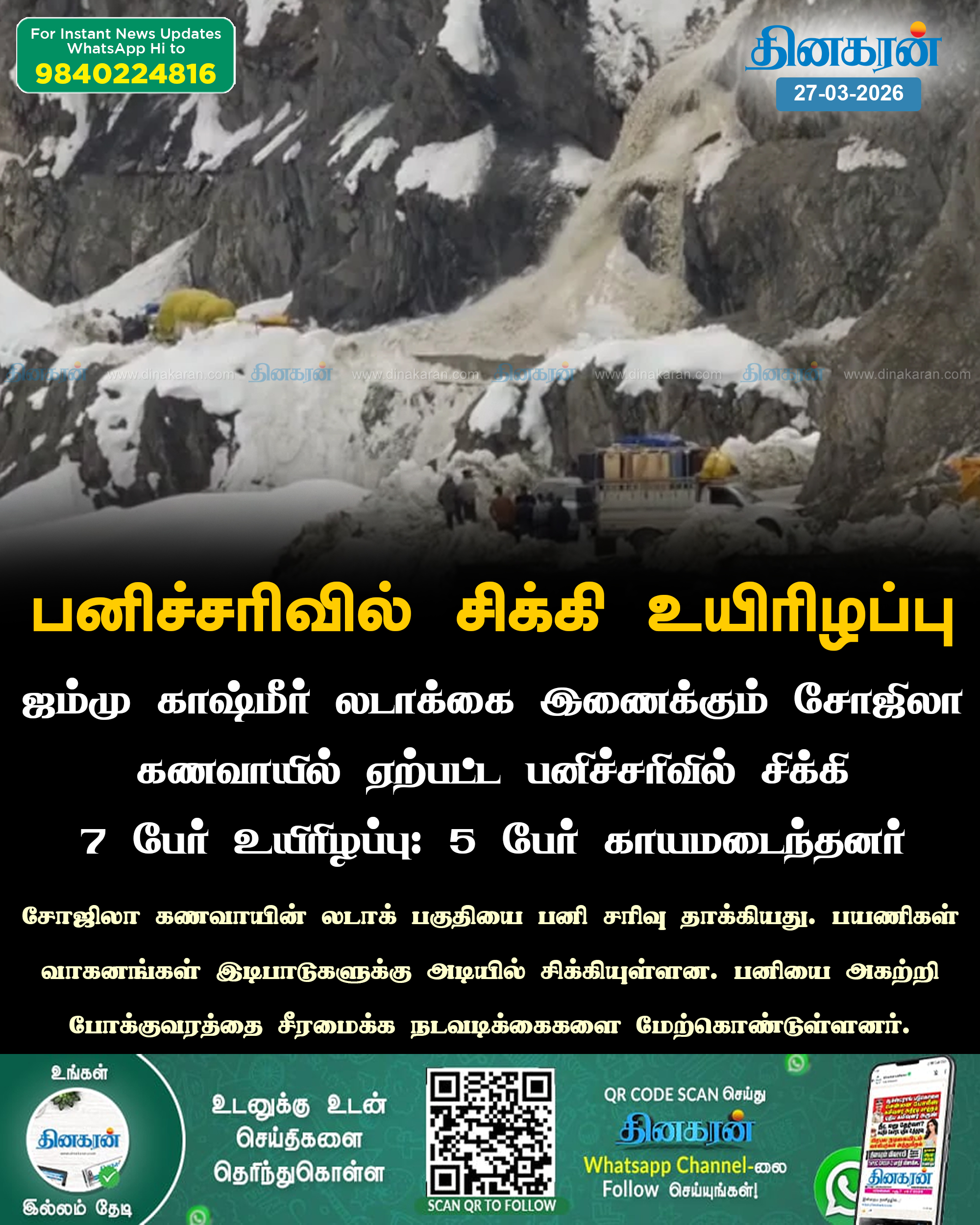 சோஜிலா கணவாயில் ஏற்பட்ட பனிச்சரிவில் சிக்கி 7 பேர் உயிரிழப்பு: 5 பேர் காயம் dinakaran.com/news/7people-k…