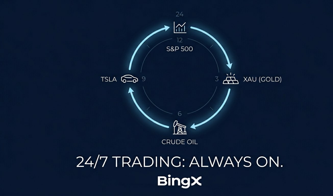BingX fixes that by offering 24/7 trading across commodities like gold and crude oil, plus indices such as the S&P 500, Nasdaq 100, and Dow Jones.