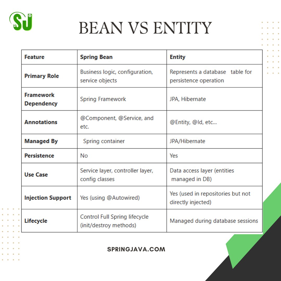 This topic will highlight the difference between Bean and Entity, including their purpose, usage, and framework dependencies.